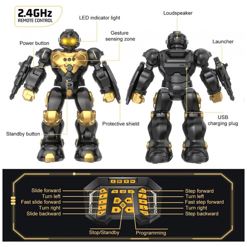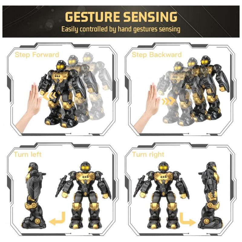 FÁCIL DE CONTROLAR O brinquedo robô RC pode ser controlado por gestos de mãos e controladores. a zona do peito do robô possui um receptor de sensor embutido, para que o brinquedo do robô se mova para frente, para trás, para a esquerda e para a direita de acordo com o seu gesto. Você também pode encontrar funções mais divertidas com o controle remoto de 2,4 GHz.
