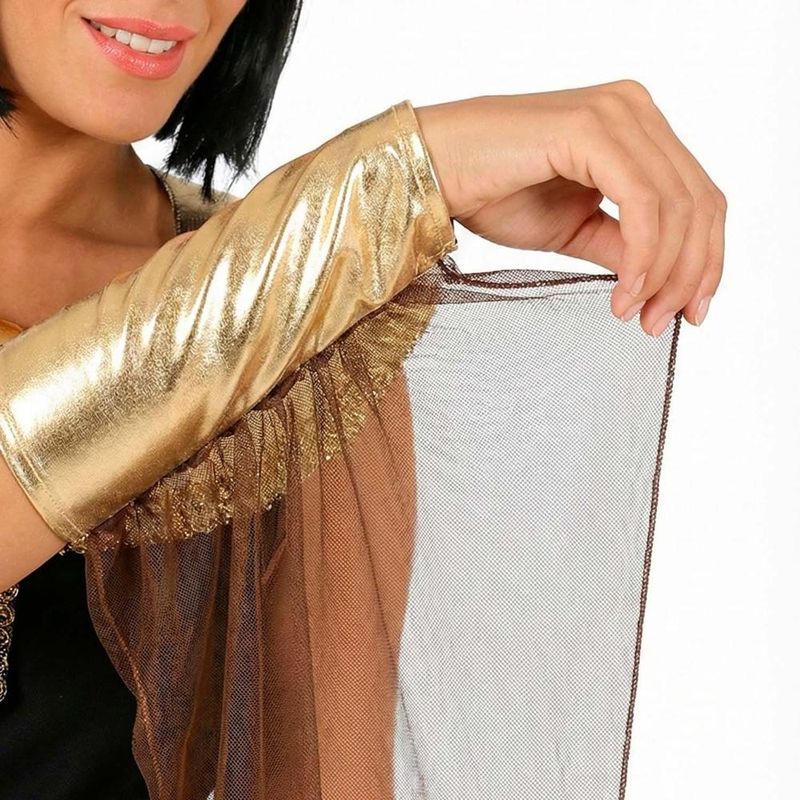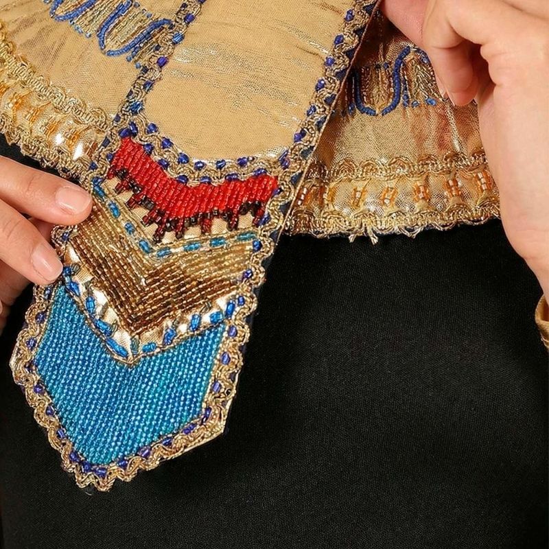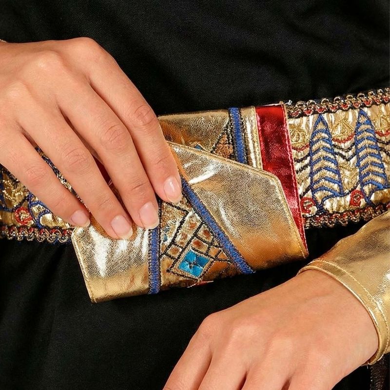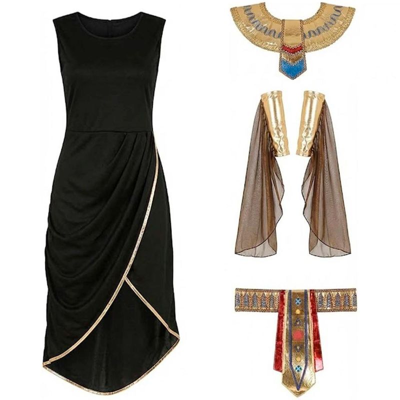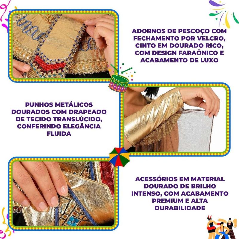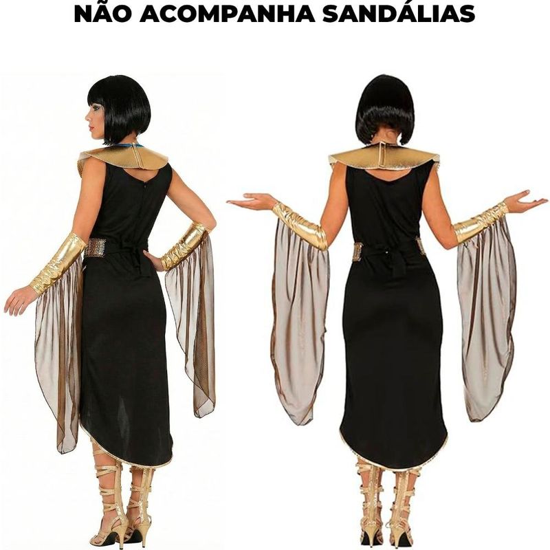 Deslumbre em qualquer festa temática ou Carnaval com esta majestosa Fantasia de Egípcia Cleópatra Adulta! O conjunto apresenta um vestido preto elegante de caimento fluido, acompanhado por acessórios luxuosos em dourado que remetem à nobreza faraônica. O colarinho detalhado e o cinto coordenado garantem um visual autêntico e sofisticado, enquanto os punhos metálicos com drapeado translúcido adicionam um toque de leveza e elegância ao movimento. Produzida com materiais de qualidade, esta fantasia oferece conforto e durabilidade para você aproveitar cada momento da celebração com estilo e confiança.Acessórios dourados Acabamento premium Punhos com drapeado de tecido Material leve e confortável OBS: NÃO ACOMPANHA SANDÁLIAS E PERUCA.