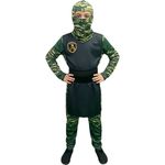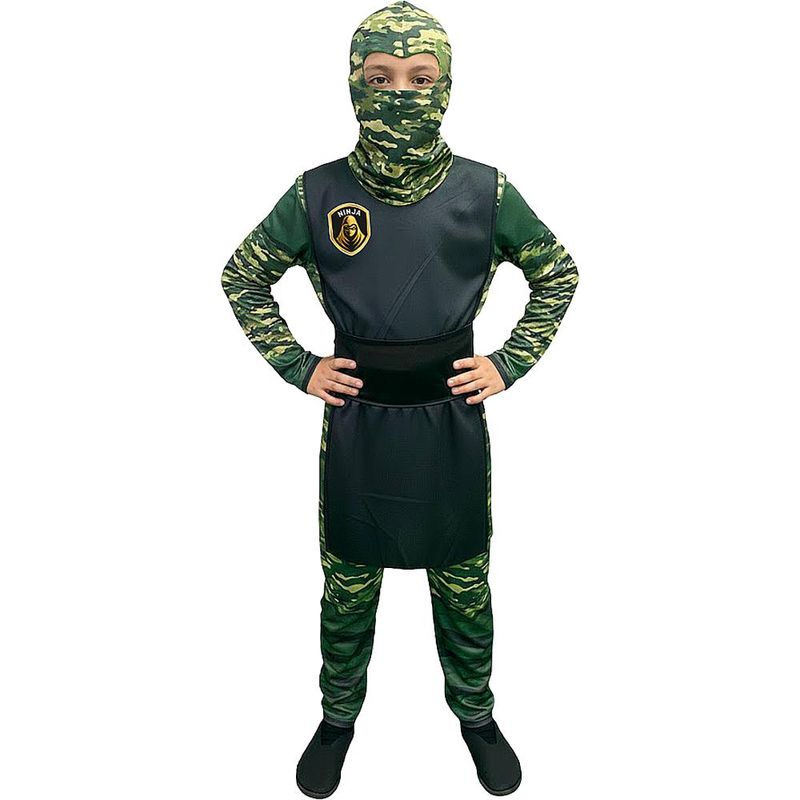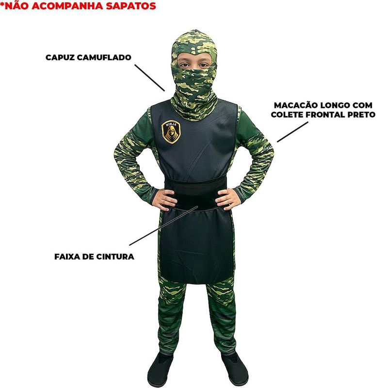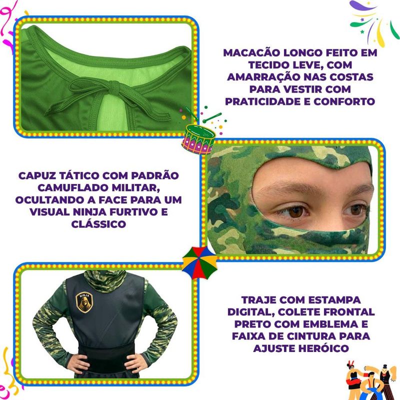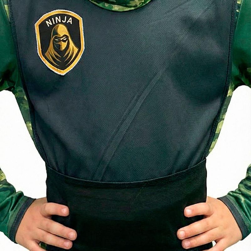 Deixe a imaginação do seu pequeno guerreiro voar com esta incrível Fantasia de Ninja Camuflado Infantil! Ideal para festas de aniversário, Carnaval ou momentos de diversão em casa, este traje foi desenvolvido para unir estilo e resistência. O macacão longo possui uma estampa digital camuflada em tons de verde, acompanhado de um colete frontal preto com emblema ninja e uma faixa de cintura que proporciona um ajuste perfeito. O capuz tático completa o visual furtivo, escondendo o rosto para uma experiência autêntica e heróica.Macacão longo em tecido leve e confortável Amarração nas costas para vestir com praticidade Capuz tático com padrão camuflado militar Colete frontal preto com emblema temático Faixa de cintura para ajuste ao corpo Perfeito para festas e brincadeiras OBS: Não acompanha sapatos.