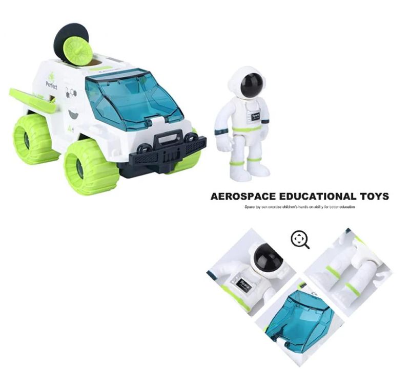 Veículo a fricção com parabólica, paínel solar, compartimentos articuláveis e roda livre. Astronauta que encaixa no interior do veículo. Alimentação: À pilha. Ind. +3 anos. Material: Plático.