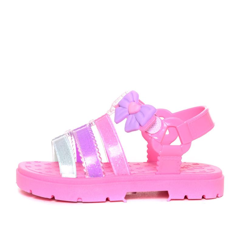 A Sandália Infantil Luelua Colors Rosa é confeccionada em material sintético, possui modelagem papete, tiras fixadoras com glitter e aplicação em forma de laço, com solado com frisos antiderrapantes e acabamento padrão.