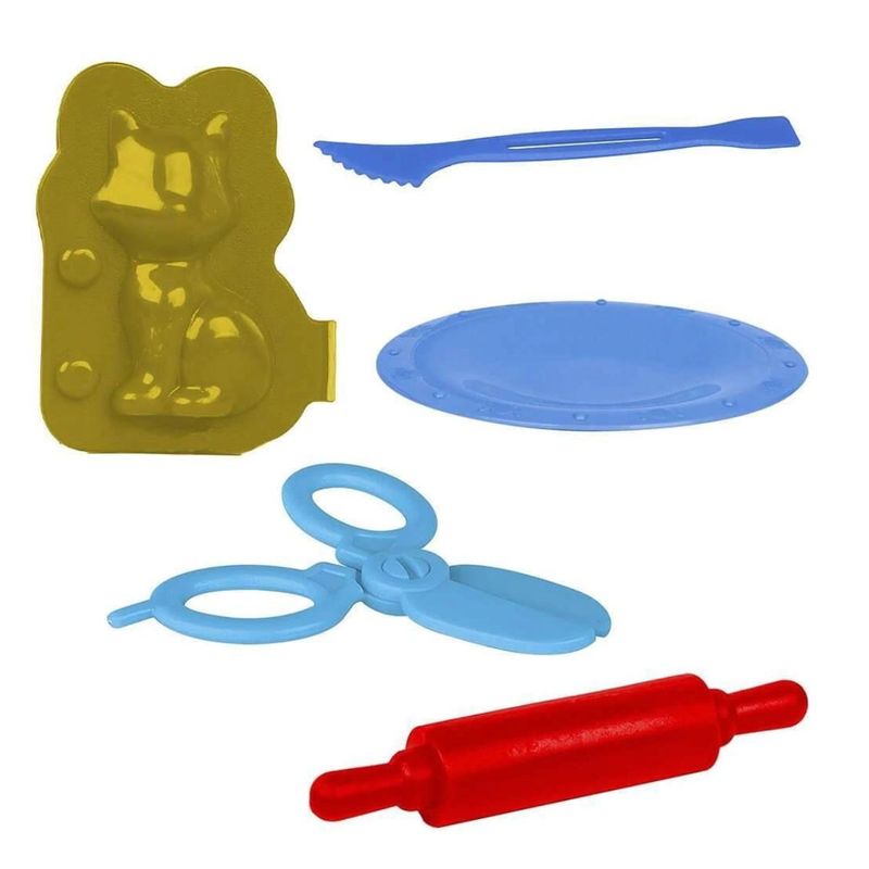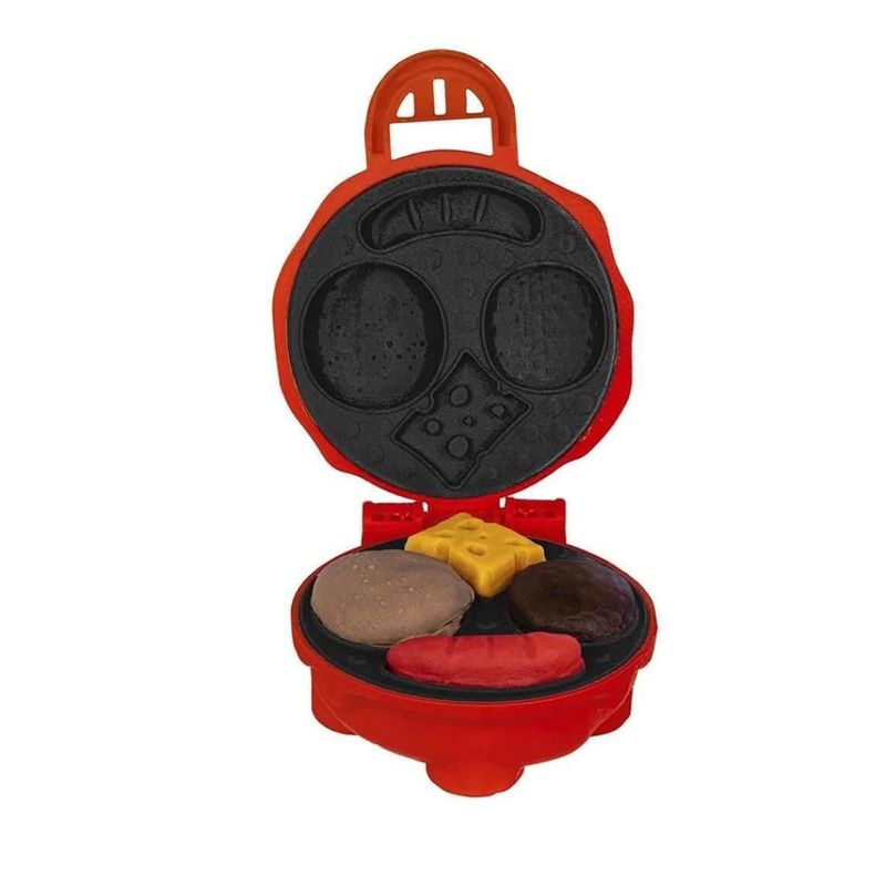 Conteúdo da embalagem: 1 Sanduicheira, 1 Tesoura, 1 Espátula, 1 Rolinho, 5 Potes de Massinhas de 50g cada, 2 Pratinhos
