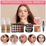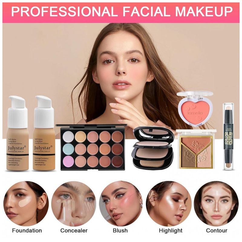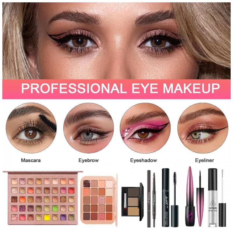 CRIE QUALQUER VISUAL COM OS KITS DE MAQUIAGEM SHELAKIN Este kit completo de maquiagem para mulheres inclui uma paleta com 40 cores de sombras, uma paleta portátil com 20 cores, paleta corretiva com 15 cores, 2 bases, 3 pós para contorno, 3 batons, 6 brilhos labiais, batom com aloe vera, bastão para contorno, pó compacto, blush, delineador, máscara para cílios, lápis para sobrancelhas, iluminador, curvex para cílios, 3 pós para sobrancelhas, 2 esponjas de maquiagem, 13 pincéis e bolsa cosmética. Este kit tudo em um é perfeito para alcançar uma maquiagem impecável e completa. Um conjunto que atende todas as suas necessidades. INGREDIENTES AMIGÁVEIS À PELE E VEGANOS Todos os cosméticos incluídos são formulados com materiais naturais e veganos, sem descamação e sem machucar a pele, ideal até mesmo para peles sensíveis. Garantimos que todos os produtos são hipoalergênicos e seguros para sua pele. Cosméticos conscientes que proporcionam uma nova dimensão à maquiagem moderna. MAQUIAGEM DE LONGA DURAÇÃO 24 HORAS Este kit para iniciantes e profissionais proporciona uma maquiagem impecável que dura 24 horas, do dia à noite. Oferece acabamento leve e radiante para todos os tipos de pele, com alta pigmentação, à prova d'água e resistente, permitindo que a pele respire enquanto mantém uma cobertura duradoura e luminosa. Fácil de remover, garantindo uma sensação suave e fresca constantemente. KIT DE PRESENTE PERFEITO O kit completo inclui todas as ferramentas essenciais para maquiagem. Um presente ideal para seu amor, família ou amigos em Dia dos Namorados, aniversário, Dia das Mães, Natal ou qualquer outra ocasião especial! Ideal para viagens e férias longas, você pode levar seu kit de maquiagem para qualquer lugar. COSMÉTICOS VEGANOS E LIVRES DE CRUELDADE Cuidamos do planeta assim como cuidamos da sua pele. Tenha a tranquilidade de que nenhum produto foi testado em animais. Todos os produtos SHELAKIN são 100% veganos e cruelty-free. Sinta-se à vontade para usar este kit de maquiagem de viagem que respeita sua pele!