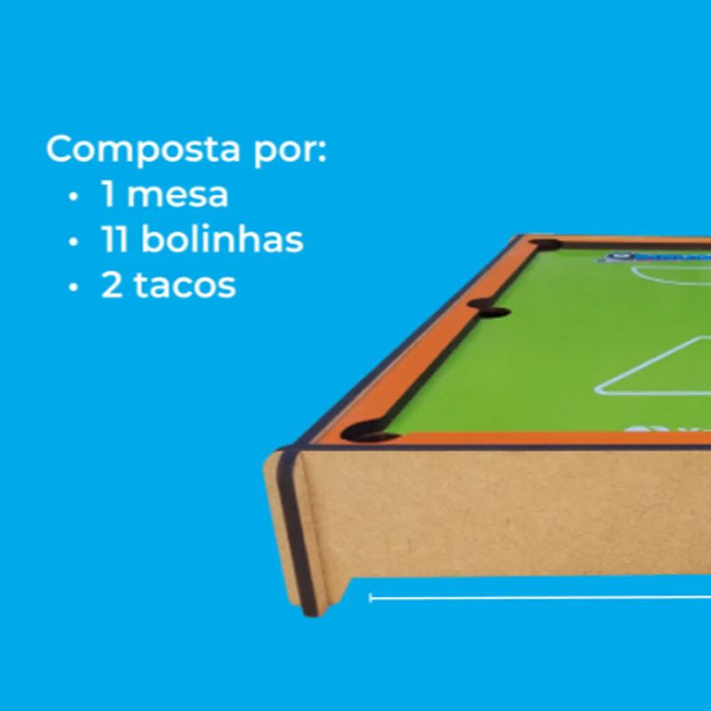 O objetivo do jogo é encaçapar as bolas coloridas, começando pela bola de menor valor até a de maior valor. O jogo termina quando todas as bolas forem encaçapadas.Se a bola clara (tacadeira) cai na caçapa, o jogador que errou a tacada deve derrubar uma bola do adversário. Cada uma das 10 bolas tem uma cor e um valor correspondente. Este jogo promove a diversão, interação e a competitividade entre os jogadores. BENEFÍCIOS:- Desenvolve a atenção;- Desenvolve o raciocínio;- Desenvolve a concentração. Chame seus amigos para este campeonato e organize a torcida!