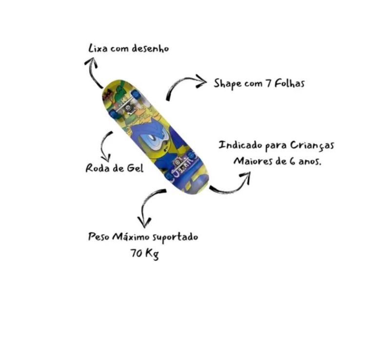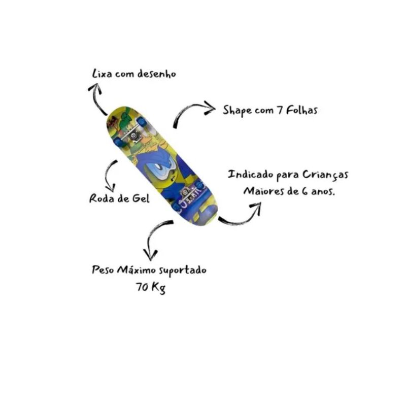 Skate Sem Acessórios - Fênix - SK108S O SKATE FÊNIX com acessórios oferece diversão de sobra e é super resistente. Possui um lado com lixa antiderrapante e o outro com diversas estampas além de contar com equipamentos de seguranças para um melhor divertimento.