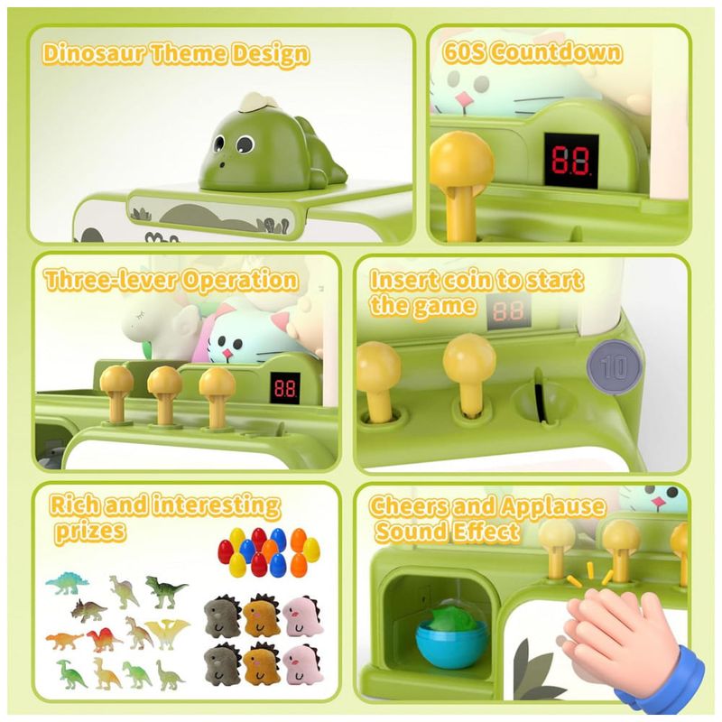 O design exclusivo inspirado em dinossauros, combinado com efeitos sonoros interativos e botão de mudo, cria uma experiência imersiva. O cronômetro de 60 segundos e os sensores de sucesso proporcionam competições divertidas entre pais e filhos, celebrando cada conquista com alegria instantânea. Com funcionamento semelhante a máquinas de arcade reais, a garra sensível de 360° permite agarrar os prêmios com facilidade, oferecendo desafios que aumentam a confiança das crianças.