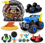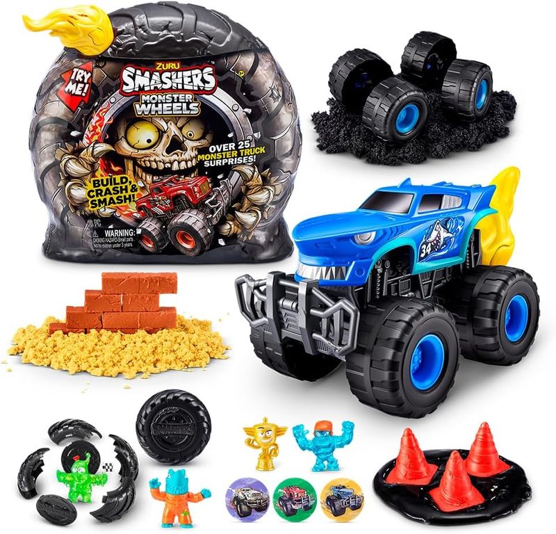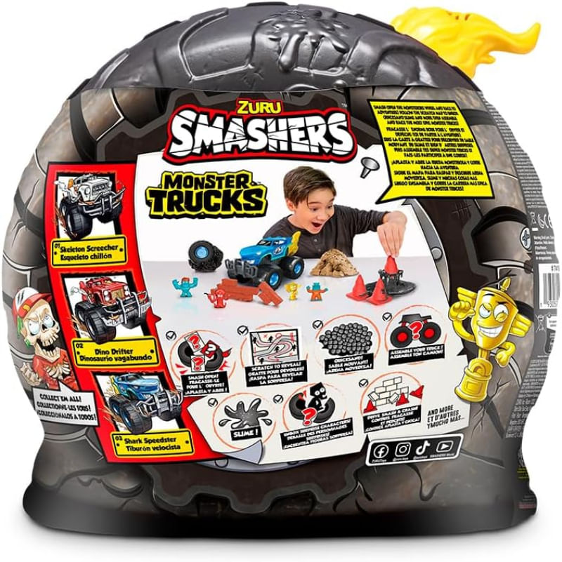 Construa, corra e esmague com a emocionante série de Smashers Monster Trucks! Prepare-se para uma aventura cheia de ação com o Smashers Monster Truck Surprise! Com este brinquedo incrível, você poderá construir, correr, colidir e esmagar como nunca antes. O desafio começa ao buscar as peças do seu Monster Truck, atravessando areia e slime em uma busca emocionante. Construa o seu caminhão e prepare o motorista antes de se PREPARAR para um incrível acidente esmagador contra a parede.