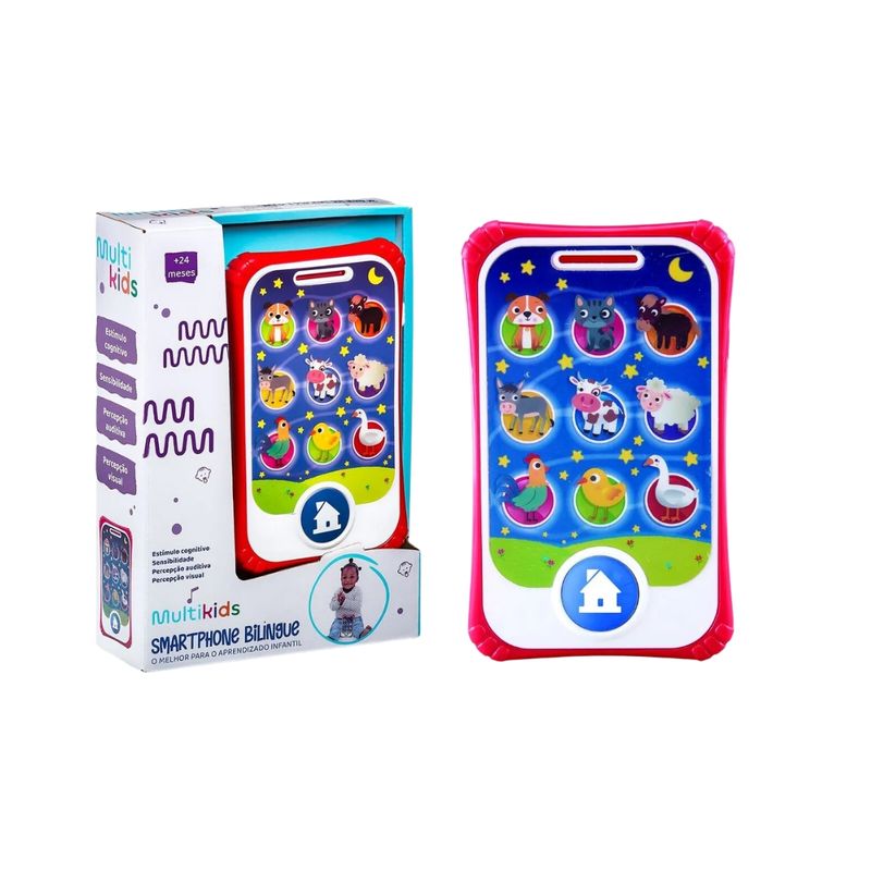 Smartphone Bilíngue Animais - Multikids   Informações do Produto: Descubra uma nova era de aprendizado com o smartphone bilíngue. Seu pequeno está pronto para explorar um mundo de conhecimento de maneira divertida e envolvente. Ao procurar um brinquedo educativo que estimule a criatividade e promova o desenvolvimento, muitos pais se deparam com a dificuldade de encontrar algo que seja verdadeiramente eficaz. É aí que o smartphone bilíngue se destaca, oferecendo uma solução única e inovadora. Introduza seu filho a duas línguas desde cedo, proporcionando um aprendizado natural e divertido. Com luzes vibrantes e sons de animais cativantes mantêm os pequenos engajados, promovendo o desenvolvimento cognitivo. Botões interativos emitem palavras educativas tanto em inglês quanto em português BR, tornando o aprendizado uma aventura emocionante. Auxilia na coordenação motora, cognitiva e percepção visual, preparando seu filho para futuros desafios.   Itens inclusos: 1 smartphone. Dimensões aproximadas do produto: AxC 15,3cm x 9,3cm. Recomendado: Não recomendado para menores de 24 meses de idade. Alimentação: Utiliza 2 pilhas AAA de 1.5v. Pilhas inclusas. Material composição: Plástico. Certificação: Registro compulsório inmetro 002362/2023. Ocp 0098. Garantia do Fabricante: 03 meses contra defeitos de fabricação.   Aviso: Todas as informações divulgadas são de responsabilidade exclusiva do fabricante/fornecedor. As cores dos tecidos ou dos produtos podem variar entre as imagens mostradas acima ou fotos da embalagem. Imagens meramente ilustrativas.
