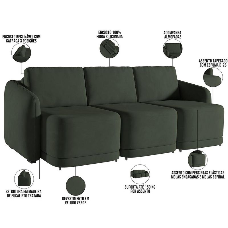 Profundidade do assento aberto: 138 cm. Características