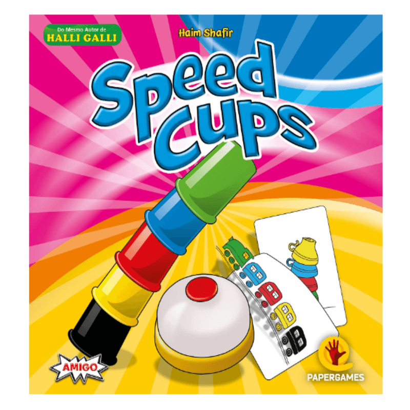 Em Speed Cups, cada jogador recebe cinco copos, um de cada cor, e tenta solucionar os desenhos das cartas, que mostram objetos coloridos - trens, pássaros, xícaras etc. - alinhados vertical ou horizontalmente. Quando uma carta é virada, os jogadores correm para recriar aquela sequência colorida com seu próprio conjunto de copos.
