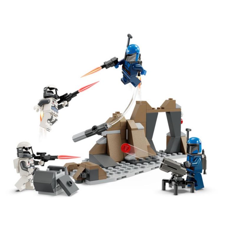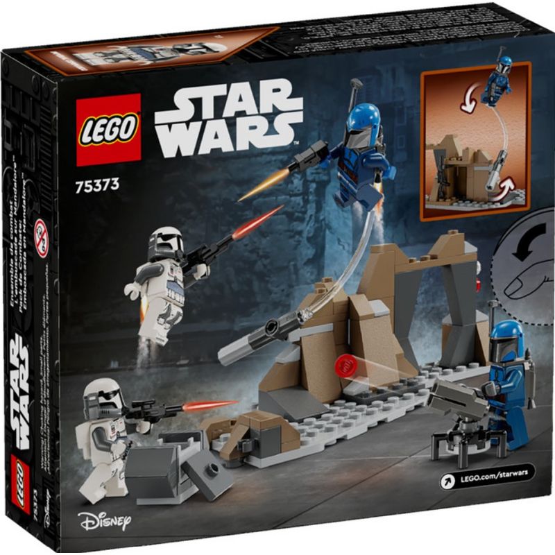 Deixe as crianças travarem batalhas épicas de jetpack com o LEGO® Star Wars : The Mandalorian Ambush on Mandalore Battle Pack (75373). Uma ideia de presente de fantasia super a qualquer momento para meninos, meninas e fãs criativos a partir de 6 anos, este conjunto de brinquedo de aventura para construir permite que eles revivam a ação de Star Wars : The Mandalorian Temporada 3 com 4 minifiguras LEGO colecionáveis: um Mandalorian Nite Owl, um Mandalorian Warrior e 2 Imperial Comandos. Há também muitos acessórios LEGO, incluindo blasters, pistolas blaster e elementos jetpack, além de um elemento transparente com uma alça para fazer uma minifigura LEGO 'voar'. Uma formação rochosa edificável com uma caverna e um canhão disparador de espigas aumenta as possibilidades inspiradoras do jogo de ação.