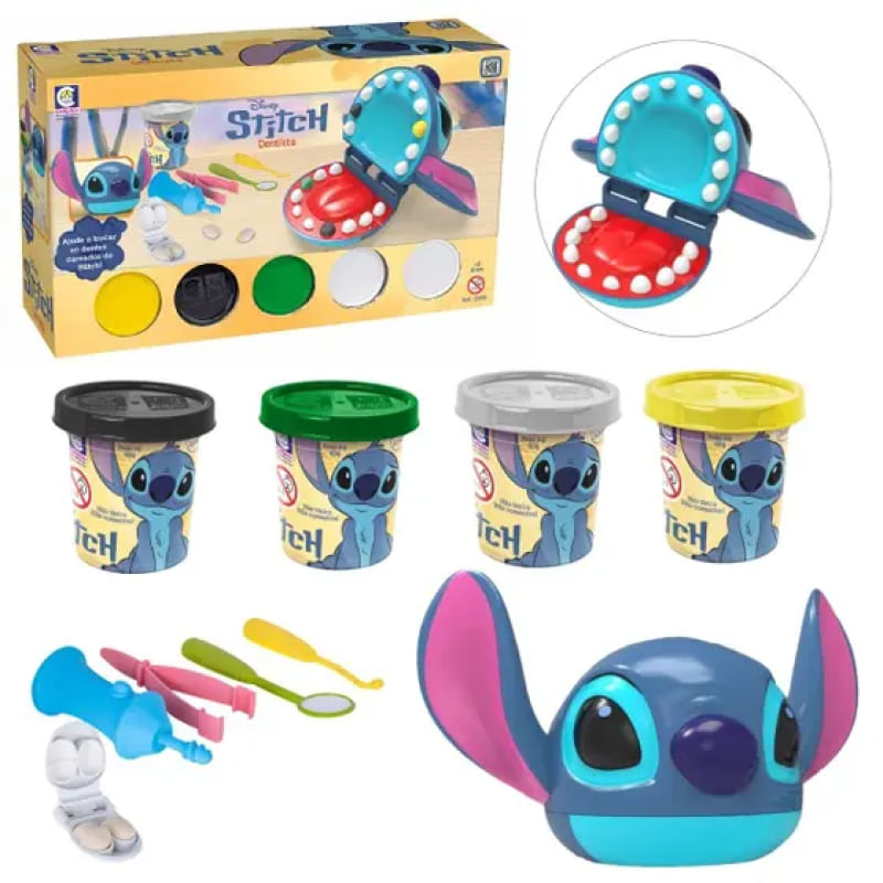 Ajude a Trocar Os Dentes Careados do Stitch! o Kit Vem com Uma Divertida Boca do Personagem Stitch, Molde Para Criar Dentes de Massinha e Diversos Acessórios de Dentista, Como Broca, Espelho e Pinça. As Massinhas Coloridas Permitem Criar Dentes Perfeitos ou Até Simular Cáries, Restaurações e Limpezas, Tornando a Brincadeira Ainda Mais Educativa. Ideal Para Estimular a Criatividade, a Coordenação Motora e Ensinar, de Forma Lúdica, a Importância da Higiene Dental.