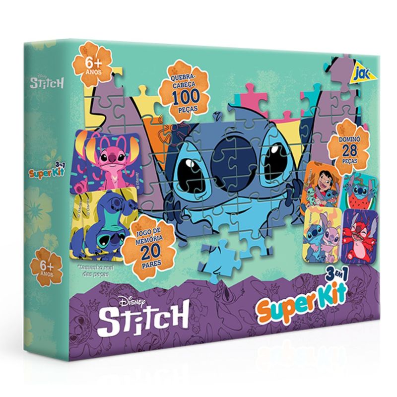 Divirta-se com este Super Kit 3 em 1 que trás Jogo da Memória, Dominó e Quebra-Cabeças baseados no Filme Stitch da Disney.