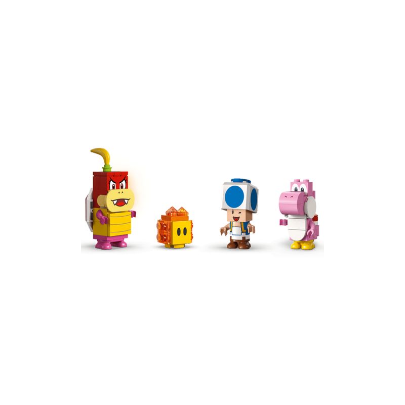 • 4 personagens LEGO® Super Mario™ – Pom Pom, um Sapo Azul, um Yoshi Rosa e uma Bolha de Lava