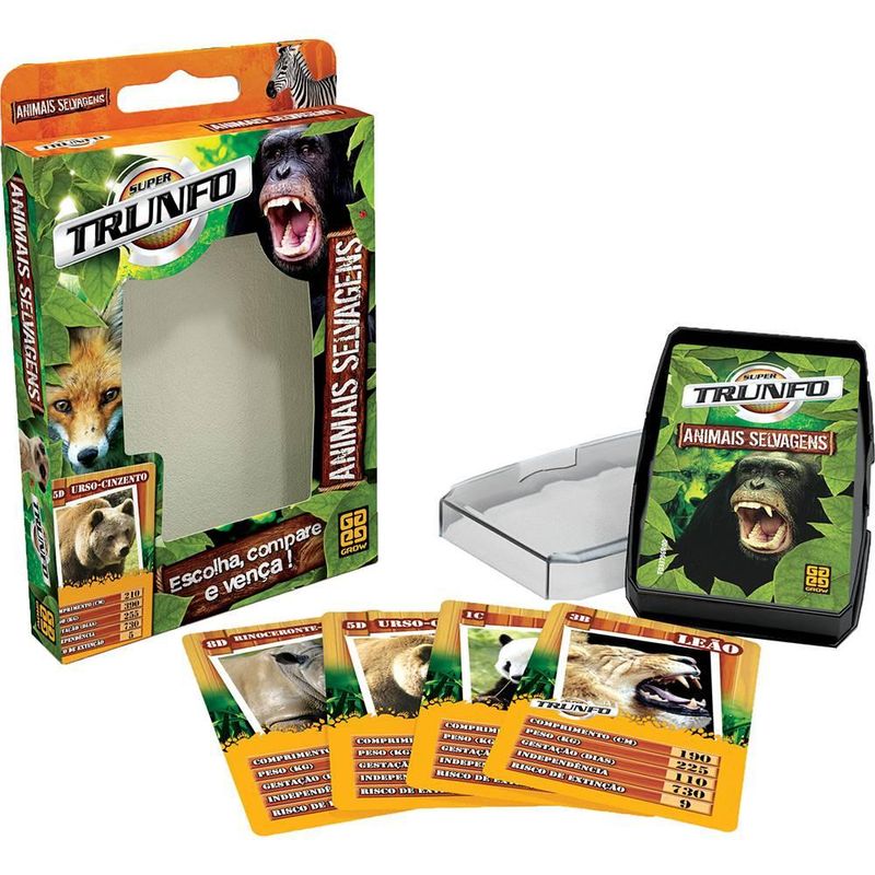 Ficha Técnica:Marca: Grow;Nome do produto: Super Trunfo Animais Selvagens;Idade recomendada: A partir de 7 anos;Selo Inmetro: CE-BRI/ICEPEX-N 01264-25 - NM300-2004 OCP 0046;Contém: 1 baralho com 32 cartas, 1 caixinha plástica e 1 manual de instruções.