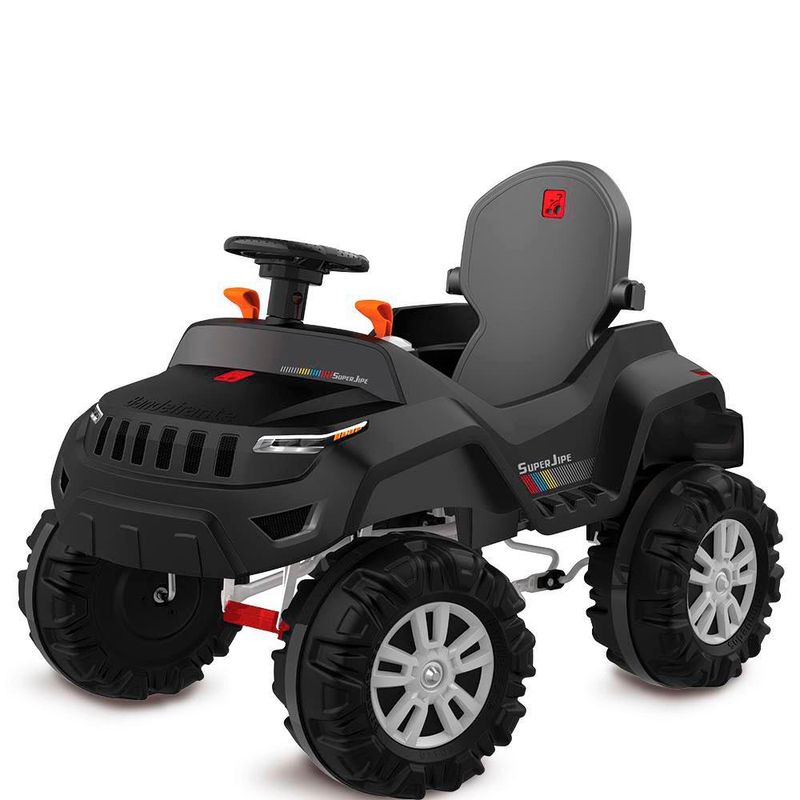 Um produto com duas funções, prático e moderno para o adulto e divertido para as crianças! FUNÇÃO PASSEIO: O adulto conduz o SuperJipe como um carro de passeio. FUNÇÃO PEDAL: Permite à criança brincar livremente como um carro a pedal. Basta remover a haste e o assoalho. - Assoalho removível: Converte rapidamente o brinquedo entre as funções PASSEIO e PEDAL.