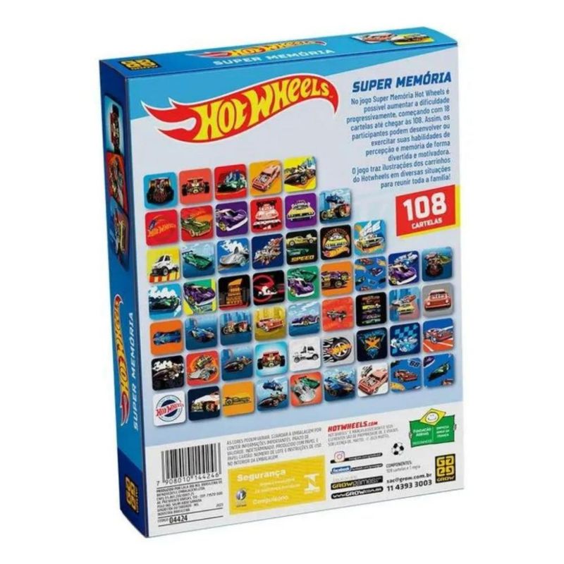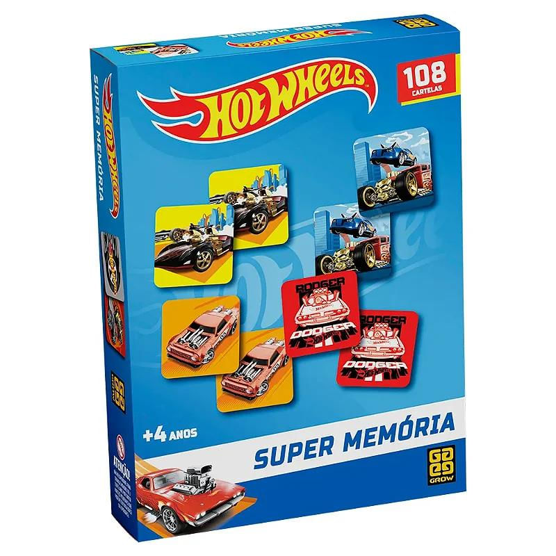 O Supermemória Hot Wheels Grow é um jogo educativo e divertido que combina o universo dos carros Hot Wheels com o clássico desafio da memória. Compacto e leve, é ideal para presentear e proporcionar momentos de lazer em família.\n\nIdade recomendada:5-7 anos;Composição/Material:Papél;Funciona com pilhas:Não;Brinquedo com luz:Não;Brinquedo com som:Não;Dimensões:26,7x20x7 cm;Peso:0,451 kg;Código de Barras:7908010144246;Garantia do Fornecedor:3 Meses contra defeito de fabricação;