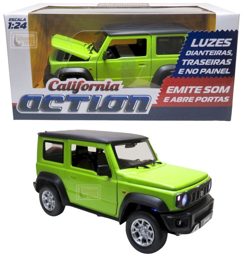 Suzuki Jimny 2018Marca do produto: California Toys.Coleção: Som e Luz - California ActionEscala: 1/24 (aproximadamente 18,5 cm de comprimento).Emite Som e Abre Portas e Capô.Luzes Dianteiras, Traseiras e no Painel.Pneus de Borracha.Fonte de Alimentação: 3 baterias AG13/LR44 1.5V (inclusas).Miniatura em Metal com Partes de Plástico.
