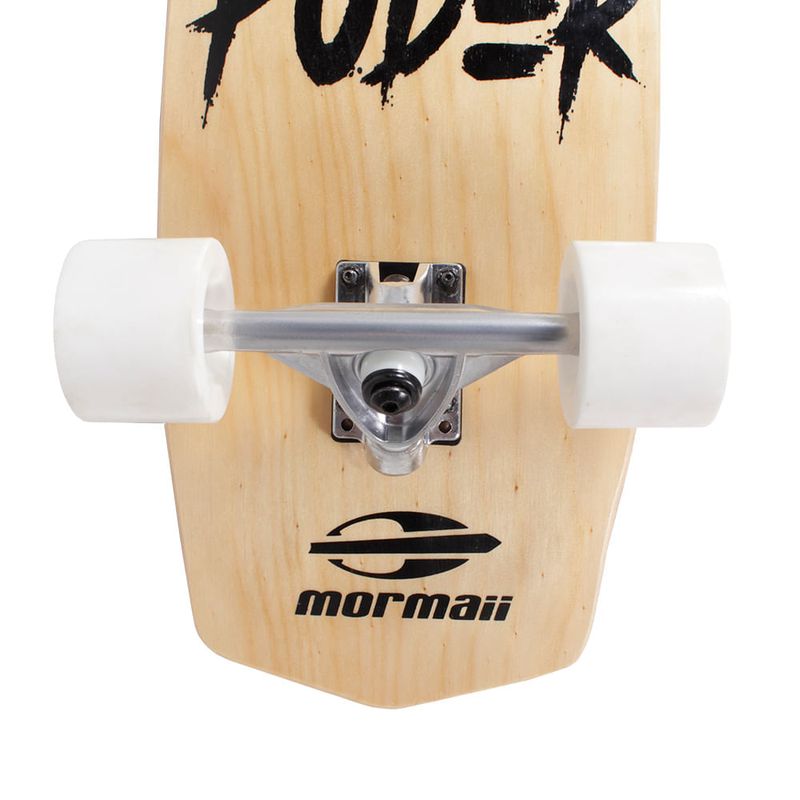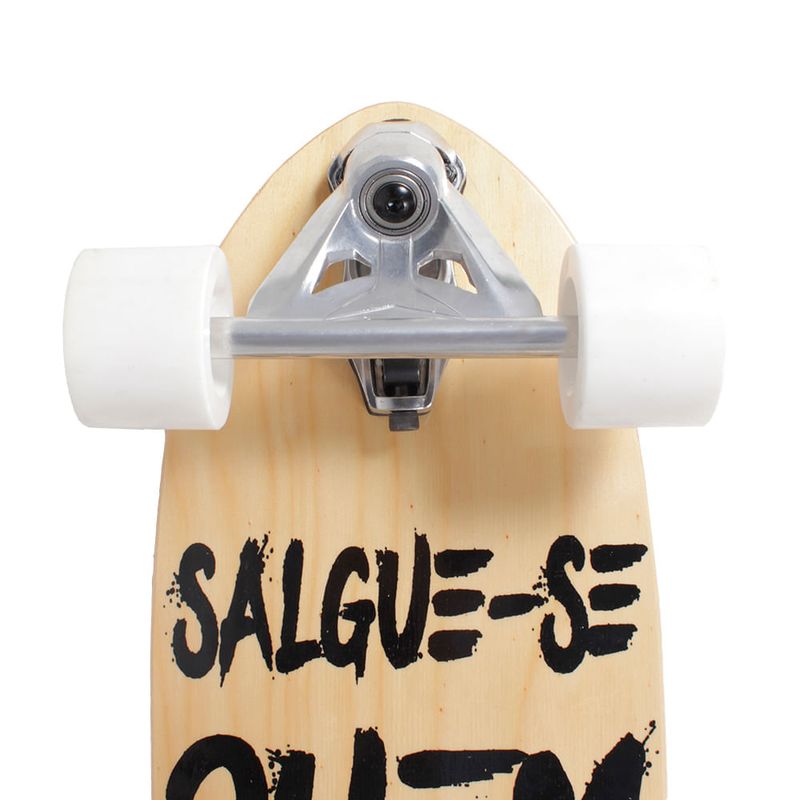O truck frontal de alumínio polido 6" simula perfeitamente as curvas do surf, enquanto o truck traseiro invertido proporciona equilíbrio e estabilidade, permitindo uma experiência de deslize autêntica.