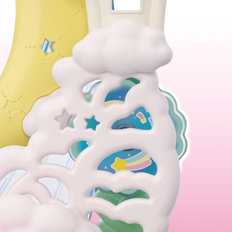 A nave voadora pode ser destacada da lua e usada separadamente. O bebê de berço Gato de Leite está usando uma roupa com uma estampa de estrela cadente para combinar com este conjunto. Muitos bonecos de bebê e de bebê de berço podem sentar no carro alegórico de lua e no trem a vapor.