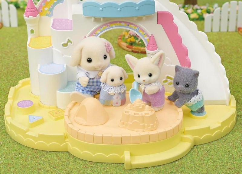 O castelo tem janelas de onde os bebês podem espiar e um grande escorregador. *Vem com brinquedos fofos para brincar na caixa de areia e na piscina, incluindo balde, pá e bola. *A piscina tem boias em que os bebês, inclusive os bebês de berço, podem se encaixar.