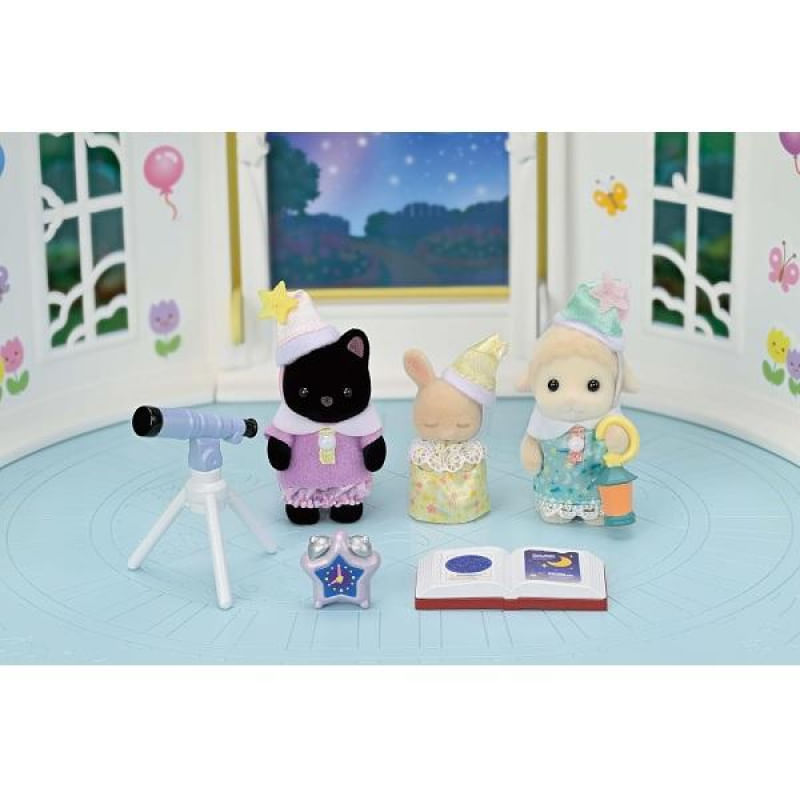 Crie cenas divertidas com os bebês observando estrelas enquanto estão em uma festa do pijama. Os bebês podem usar o telescópio e o livro de constelações para observar as estrelas.