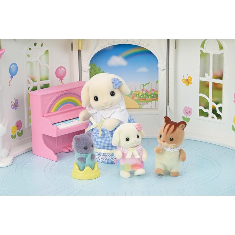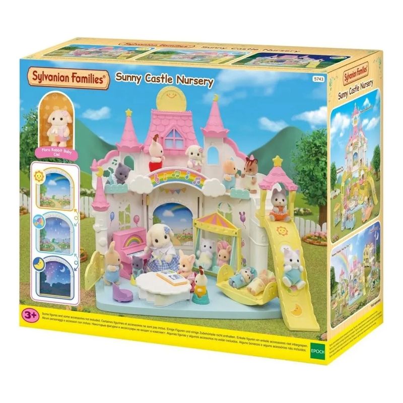 *O Castelo Ensolarado Jardim de Infância vem com um jardim de infância com mudança de tempo e o Bebê Coelho Floral. *O jardim de infância vem com todo tipo de coisas divertidas, incluindo um piano, balanço, escorregadores e berço. *Mude o céu fora da janela e brinque com jogos adequados para o tempo! Você pode até fazer o sol nascer! *O jardim de infância é projetado para que seja possível mudar o tempo. *Movimente a alavanca ou o sol para mudar o céu e brinque com jogos adequados para o tempo. Há três tipos: sol, chuva e noite. *A prancheta de desenhar e a mesa se transformam em equipamentos de playground divertidos para os bebês. *A Bebê Coelho Floral usa uma roupa de arco-íris e uma flor linda na orelha. O boneco pode fazer várias poses. *Ciel, a bebê Coelho Floral, ama brincar ao ar livre. Seu jogo preferido é esguichar a mangueira em todas as direções para que o sol faça arcos-íris na água. Ela sempre fica encharcada! *Combine com o Ônibus Arco-Íris e a Piscina & Caixa de Areia Jardim de Infância (vendidos separadamente) para fazer um jardim de infância que se parece com um castelo grande. *Combine com o Ônibus Arco-Íris, a Piscina & Caixa de Areia Jardim de Infância, o Balanço Jardim de Infância, os Amigos do Jardim da Infância e a Família dos Coelhos Floral (vendidos separadamente) para ainda mais diversão. *Combine com a Família dos Coelhos Floral, o Conjunto de Jardinagem – Irmã e Irmão Coelhos Floral e os Gêmeos Coelho Floral (vendidos separadamente) para colecionar toda a família para ainda mais diversão.