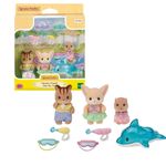 Vem com três bebês, o golfinho inflável e brinquedos de piscina oferecem muita diversão na hora de brincar na piscina, os bebês estão usando roupas fofas de natação com estampas de onda e botões em formato de concha, acompanham os brinquedos de piscina e os óculos de natação