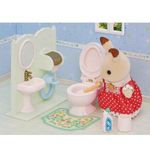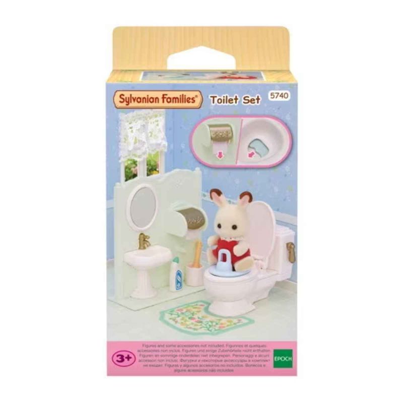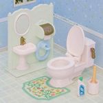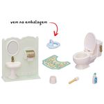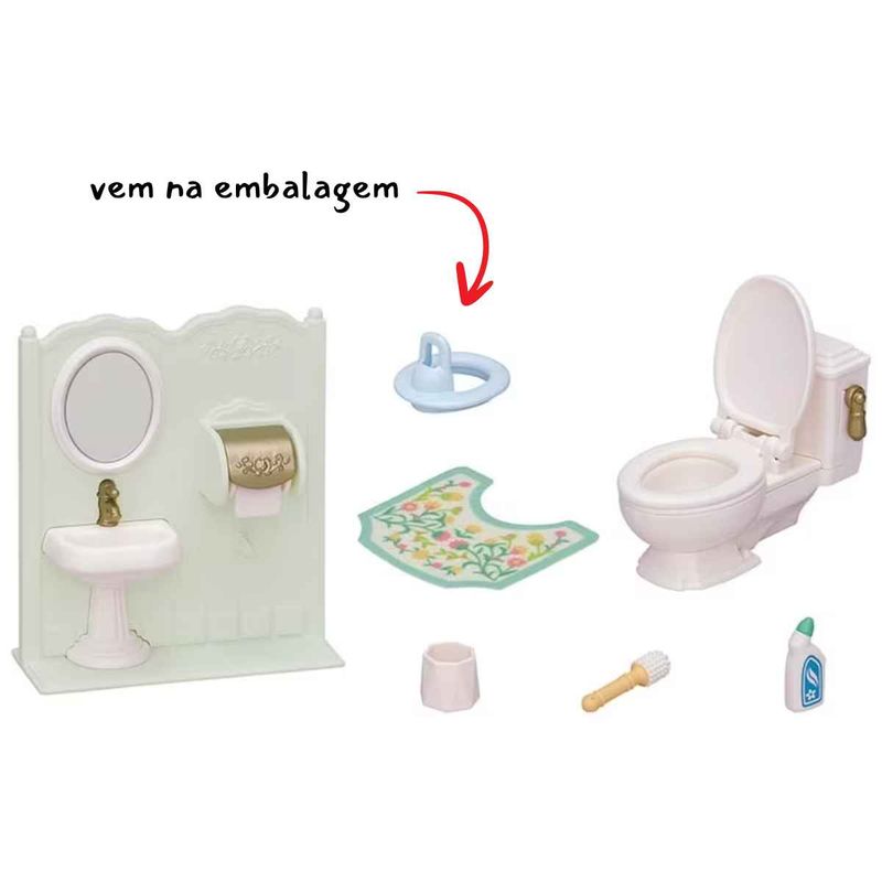 O Conjunto de Toalete vem com vaso sanitário, pia, produtos de limpeza, penico e tapetinho. É possível acionar a descarga puxando a alavanca do vaso sanitário e o papel higiênico pode ser desenrolado. Os bonecos podem se sentar no vaso sanitário. O assento do penico pode ser acoplado ao vaso sanitário para treinar os bebês para usá-lo. A pia inclui espelho, cuba e porta-papel higiênico. Há até um espaço para guardar o penico. Você pode usar o limpador e a escova para limpar o vaso sanitário.