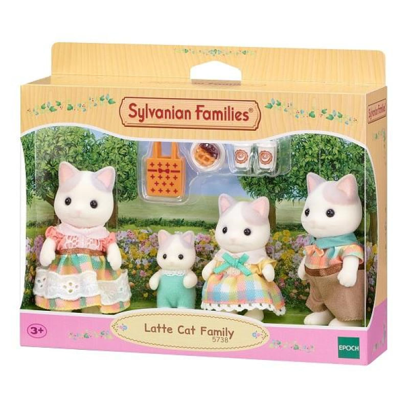 A Família dos Gatos de Leite tem cores suaves e manchas arredondadas. Este conjunto vem com pai, mãe, menina, bebê e diversos acessórios.