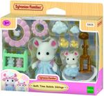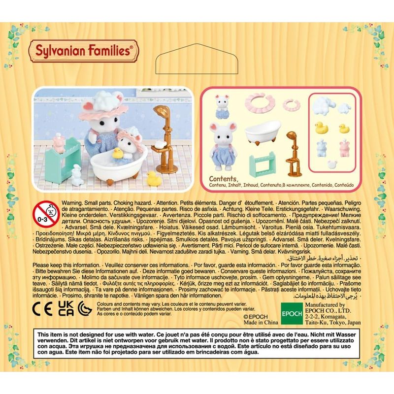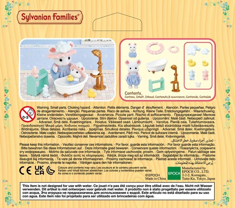 A hora do banho é divertida com este conjunto que inclui o menino e o bebê de berço Rato Marshmallow com vários acessórios de banho. Os acessórios combinando incluem uma banheira para bebê, um chuveiro, brinquedos de banho e toucas de banho. As toucas de banho e as bolhas podem ser colocadas nas cabeças dos bonecos. Os adoráveis frascos e sabonetes têm o formato dos bonecos Rato Marshmallow. O sabonete pode ser colocado na saboneteira do chuveiro e os frascos e brinquedos de banho podem ser colocados no suporte. O menino e o bebê de berço usam roupas feitas de material macio e atoalhado.