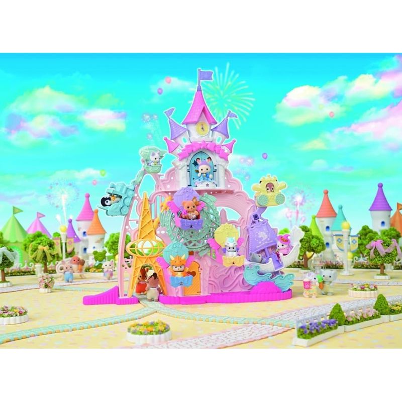 Este divertido parque de diversões dos sonho vem completo com um castelo com um relógio e uma variedade de atrações emocionantes. Vem com o Bebê Coelho Chocolate vestindo um vestido de princesa. Todas as atrações pode ser desfrutadas por bebês e bebês de berço. Os ponteiros do relógio podem ser movidos. A roda gigante pode ser girada. O navio viking com tema de unicórnio balança junto com as ondas. A carruagem puxada por cavalos cruzando o céu pode ser movida da esquerda para a direita. O trem a vapor pode ser conduzido para cima e para baixo. O navio voador pode transportar um bebê de berço.