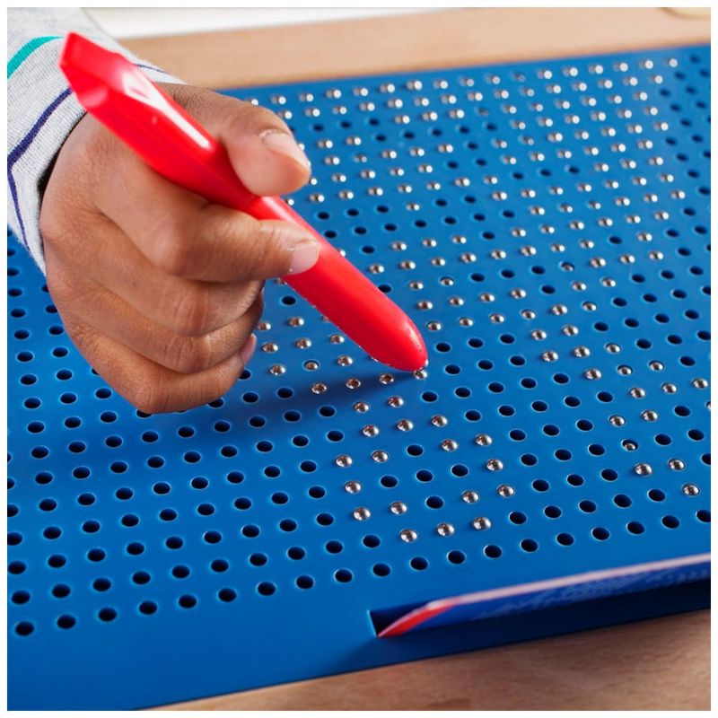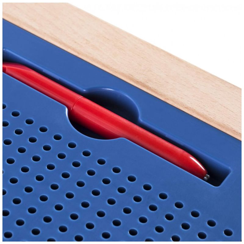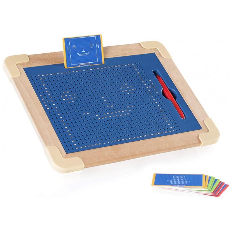 O Guidecraft Magna Tablet Deluxe é um tablet de desenho magnético com moldura em madeira de faia e superfície plástica perfurada, no qual a criança usa uma caneta magnética para puxar esferas metálicas e formar desenhos, letras e padrões. A borracha magnética interna permite apagar os desenhos pressionando as esferas de volta para dentro da base, possibilitando uso repetido em atividades de coordenação motora fina e pré-escrita.?