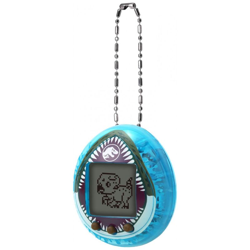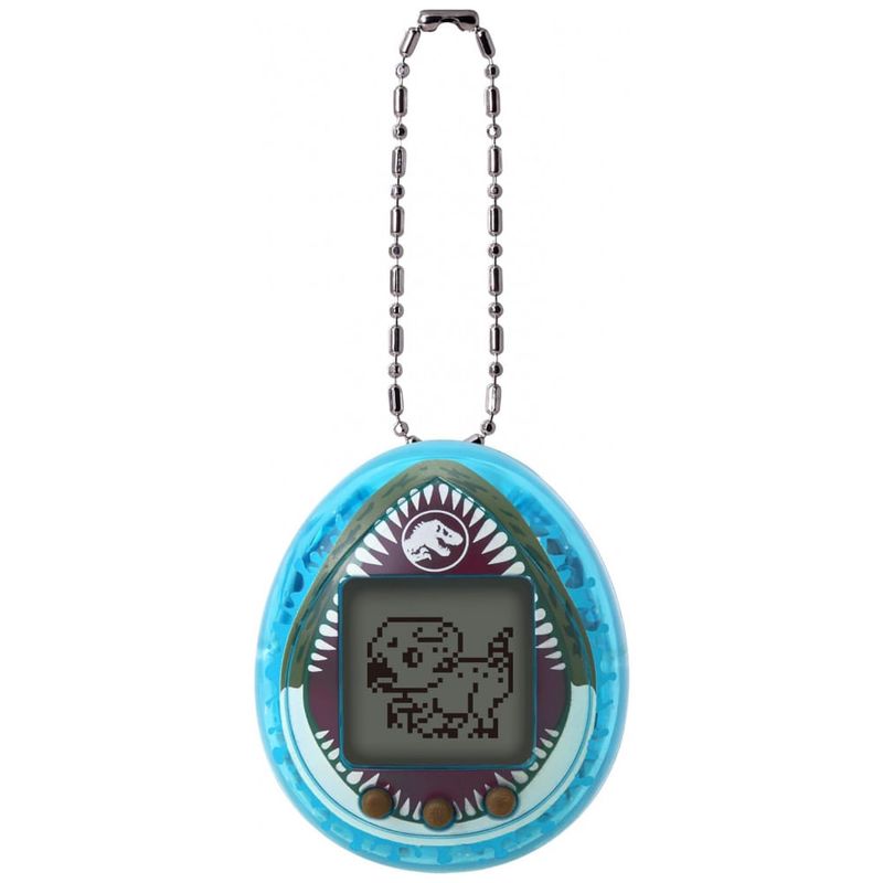 Tamagotchi Nano Jurassic World Rebirth Mosasaurus é um brinquedo eletrônico portátil que permite cuidar de dinossauros virtuais em um dispositivo em formato de ovo com acabamento azul translúcido inspirado no Mosasaurus saindo do oceano. O produto faz parte da colaboração oficial com a franquia Jurassic World Rebirth e apresenta cenas e animações baseadas nos filmes ao longo do dia.?