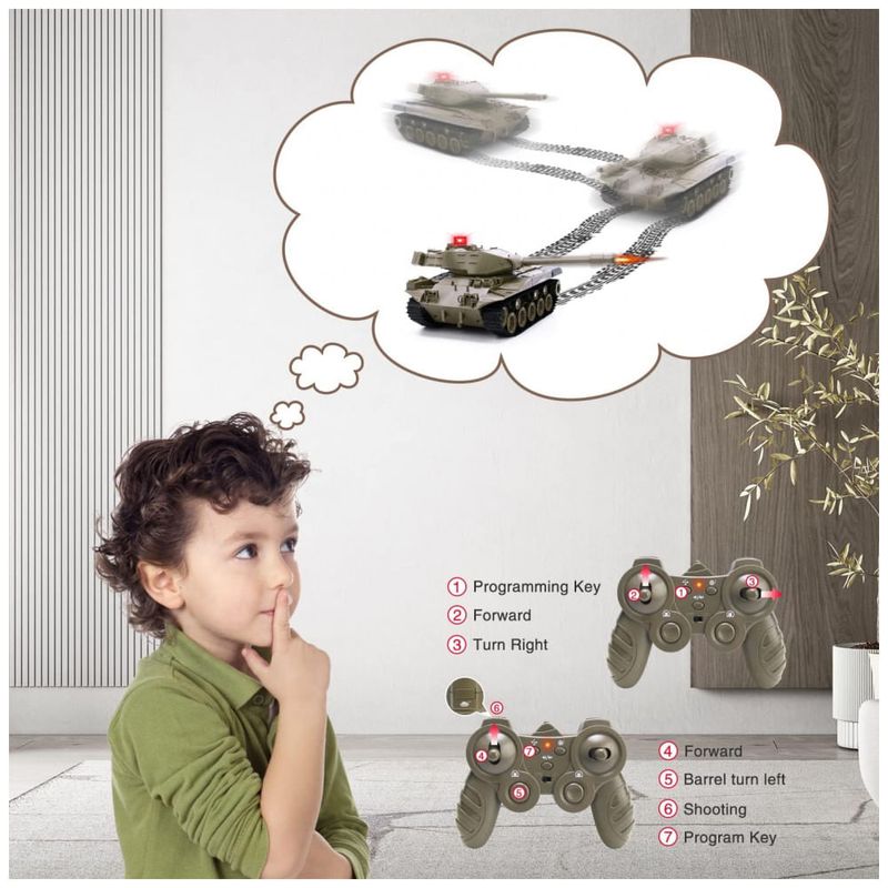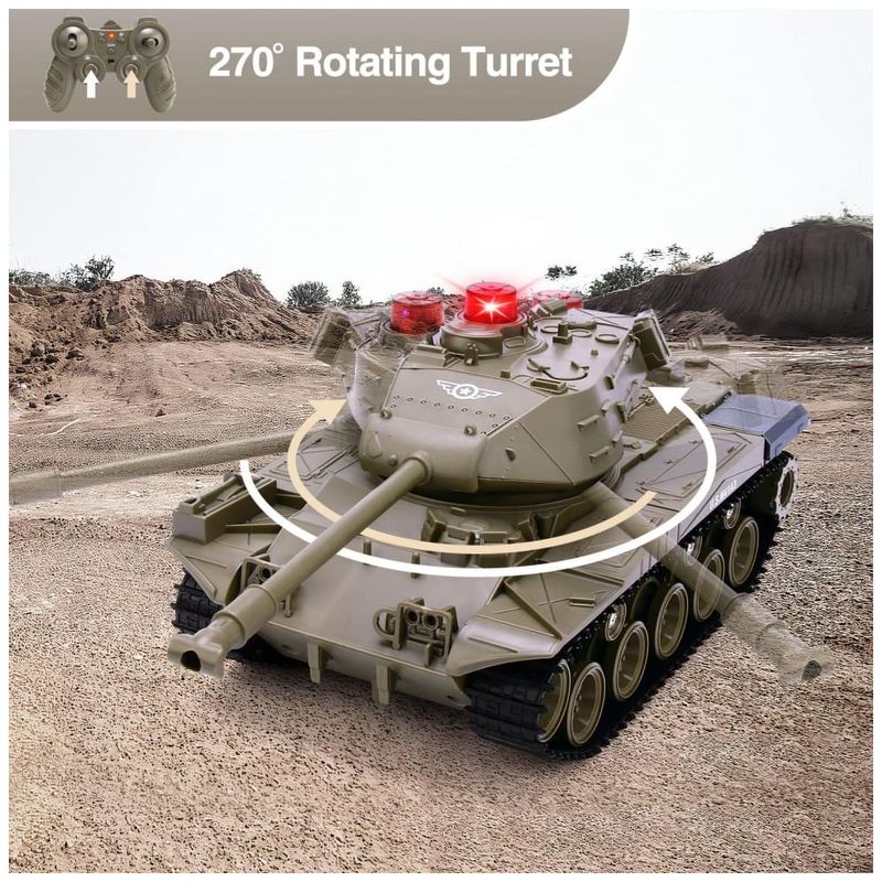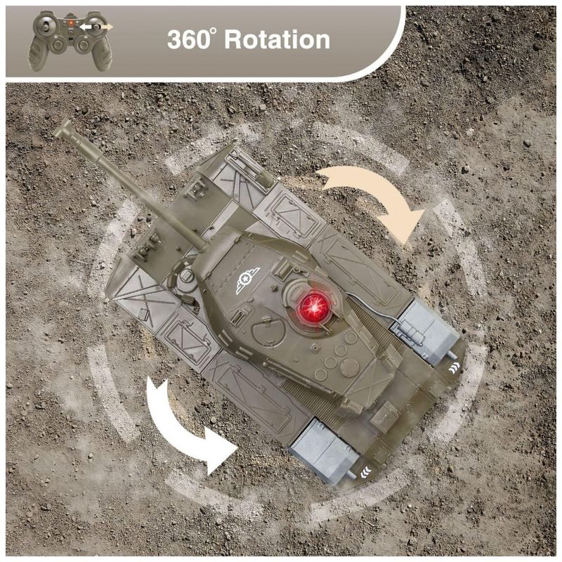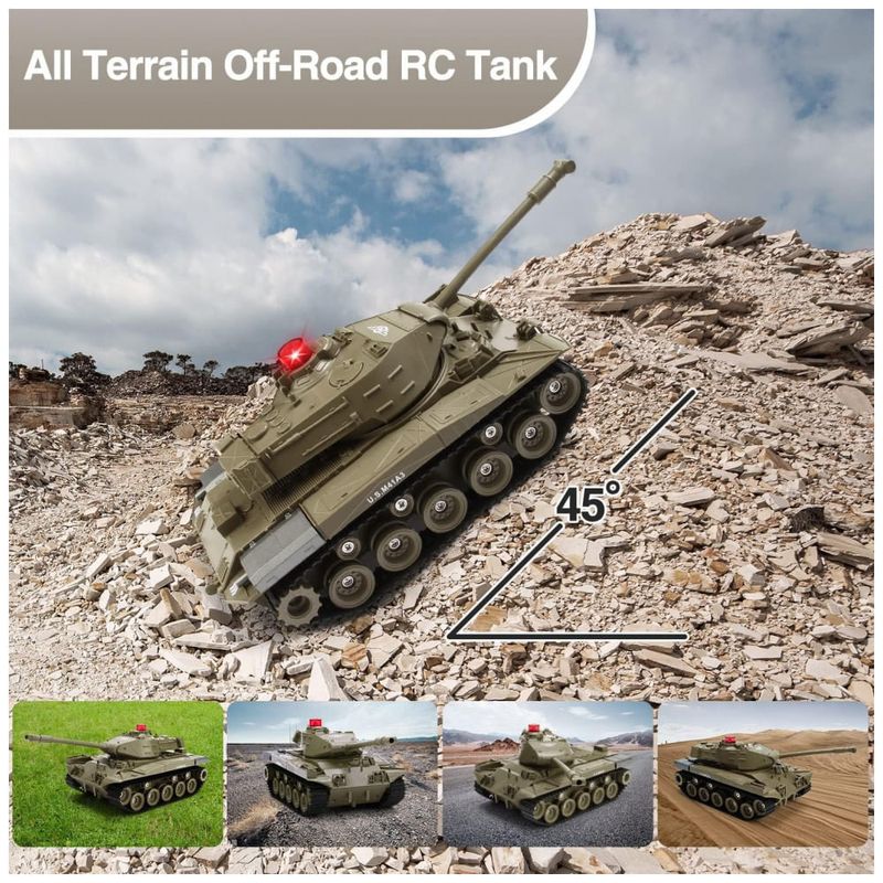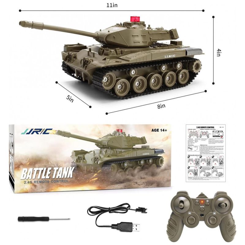 Este veículo RC é um brinquedo multifuncional que pode simular sons de batalhas de tanques, como canhões, metralhadoras e sons de motores. Com controle remoto, é possível simular o movimento do tanque para frente e para trás, virar à esquerda, rotação da torre 270 e outras ações. Também possui função de programação que permite programar ações para o tanque repetir. Além disso, tem forte capacidade de escalada em terrenos complexos como gramado, praia e rochas, com um gradiente máximo de escalada de aproximadamente 45 graus. O tanque mede 27,94 cm x 12,70 cm x 10,16 cm e é equipado com uma bateria recarregável embutida de 3,7V 500mAh, que oferece até 20 minutos de tempo de jogo durante o carregamento completo. É feito de plástico ABS não tóxico de alta qualidade, anti-queda, forte e durável, sendo uma ótima opção de presente para crianças em datas especiais como aniversários e Natal.
