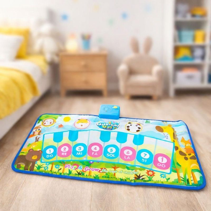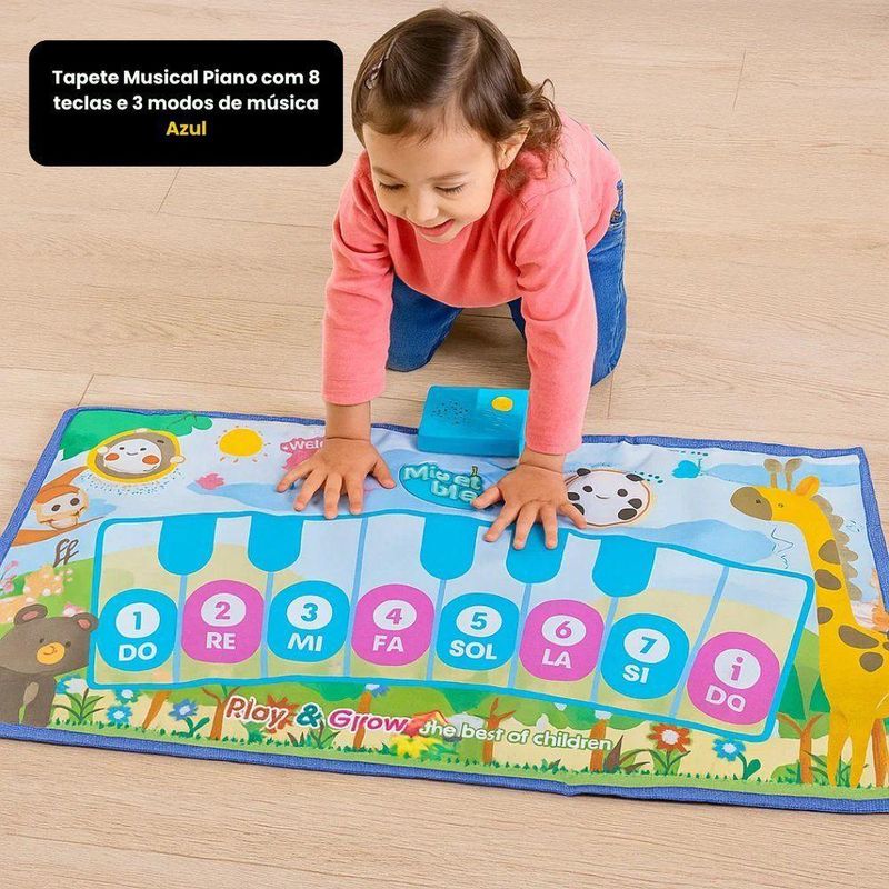 Tapete De Atividades Musical Piano Interativo Educativo BebêTapete Musical Piano com 8 Teclas e 3 Modos de Música, Educativo e InterativoO Tapete Musical Piano Infantil é o brinquedo perfeito para unir diversão, aprendizado e desenvolvimento infantil desde os primeiros anos de vida. Desenvolvido para estimular a coordenação motora, a percepção sonora e o raciocínio cognitivo, ele transforma cada momento de brincadeira em uma experiência educativa e envolvente.Com 8 teclas musicais coloridas e 3 modos de música interativos, o tapete permite que a criança explore sons, notas musicais e cores de forma lúdica, incentivando o aprendizado por meio da curiosidade e da experimentação. Ao pisar ou tocar as teclas, o bebê desenvolve habilidades motoras, reconhecimento auditivo e noções básicas de música.Produzido em material plástico resistente, leve e seguro, o tapete musical é ideal para o uso diário. Sua superfície é fácil de limpar, garantindo mais praticidade para pais e cuidadores. O design colorido, com animais e elementos da natureza, chama a atenção das crianças e estimula a imaginação, tornando a brincadeira ainda mais atrativa.Indicado para brincadeiras individuais ou em grupo, o tapete musical com piano interativo é uma excelente opção de brinquedo educativo para bebês e crianças, sendo também uma ótima ideia de presente para estimular o desenvolvimento desde cedo.Principais Benefícios:- Estimula o desenvolvimento cognitivo e motor- Incentiva o aprendizado musical desde a infância- Desenvolve coordenação, audição e percepção de cores- Brinquedo educativo, interativo e divertido- Material resistente, leve e fácil de limparEspecificações do Produto:- Dimensões: 47 cm (altura) x 80 cm (largura)- Composição: Plástico resistente- Alimentação: 3 pilhas AA (não inclusas)- Modos: 3 modos musicais interativos- Cor: Azul- Peso: 200 gConteúdo da Embalagem:- 01 Tapete Musical Piano com 8 teclas e 3 modos de música – AzulTapete Musical Piano com 8 Teclas e 3 Modos de Música, Educativo e InterativoO Tapete Musical Piano Infantil é o brinquedo perfeito para unir diversão, aprendizado e desenvolvimento infantil desde os primeiros anos de vida. Desenvolvido para estimular a coordenação motora, a percepção sonora e o raciocínio cognitivo, ele transforma cada momento de brincadeira em uma experiência educativa e envolvente.Com 8 teclas musicais coloridas e 3 modos de música interativos, o tapete permite que a criança explore sons, notas musicais e cores de forma lúdica, incentivando o aprendizado por meio da curiosidade e da experimentação. Ao pisar ou tocar as teclas, o bebê desenvolve habilidades motoras, reconhecimento auditivo e noções básicas de música.Produzido em material plástico resistente, leve e seguro, o tapete musical é ideal para o uso diário. Sua superfície é fácil de limpar, garantindo mais praticidade para pais e cuidadores. O design colorido, com animais e elementos da natureza, chama a atenção das crianças e estimula a imaginação, tornando a brincadeira ainda mais atrativa.Indicado para brincadeiras individuais ou em grupo, o tapete musical com piano interativo é uma excelente opção de brinquedo educativo para bebês e crianças, sendo também uma ótima ideia de presente para estimular o desenvolvimento desde cedo.Principais Benefícios:- Estimula o desenvolvimento cognitivo e motor- Incentiva o aprendizado musical desde a infância- Desenvolve coordenação, audição e percepção de cores- Brinquedo educativo, interativo e divertido- Material resistente, leve e fácil de limparEspecificações do Produto:- Dimensões: 47 cm (altura) x 80 cm (largura)- Composição: Plástico resistente- Alimentação: 3 pilhas AA (não inclusas)- Modos: 3 modos musicais interativos- Cor: Azul- Peso: 200 gConteúdo da Embalagem:- 01 Tapete Musical Piano com 8 teclas e 3 modos de música – Azul