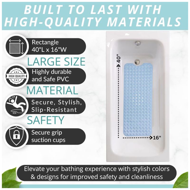Desfrute de uma proteção completa com o tapete de banho Enkosi, fabricado com material antiderrapante de alta qualidade. Com 200 ventosas estrategicamente posicionadas, este tapete oferece uma aderência máxima, evitando escorregões e quedas acidentais. Seu design ergonômico e tamanho extra grande 101,6 cm x 40,64 cm proporcionam segurança para idosos, bebês e crianças pequenas durante o banho. Além disso, o tapete é moderno, resistente e durável, complementando a decoração do seu banheiro em diversas variações de cores. Para manter a higiene, basta colocá lo na máquina de lavar. Compre com confiança, pois valorizamos sua experiência e oferecemos um produto de qualidade sem mencionar garantias ou suporte.