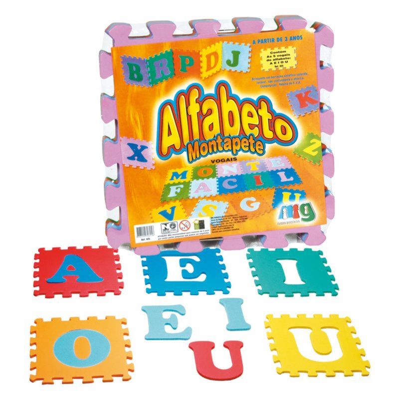 Kit com as 5 vogais (a, e, i, o, u) em e.v.a. colorido, medindo 33 x 33 cm e 8 mm de espessura.