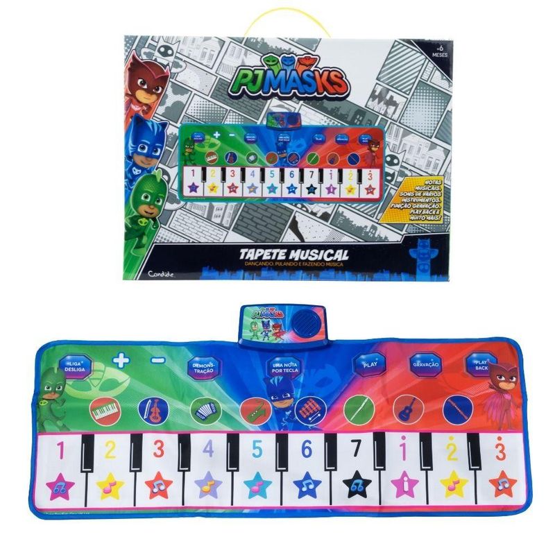 Com o Tapete Piano PJ Masks você poderá ser o artista do seu show! Além de compartilhar esse divertido momento com o Menino Gato, a Corujita e o Lagartixo! O tapete tem 8 músicas, diferentes sons, 19 teclas de piano e ainda um jogo de perguntas! Quem será que vai ganhar o jogo? Você, o Menino Gato, a Corujita ou o Lagartixo? A brincadeira vai ficar muito mais animada com este Tapete Piano da PJ Masks! Resumindo: • Com o Tapete Piano PJ Masks você poderá ser o artista do seu show! Além de compartilhar esse divertido momento com o Menino Gato, a Corujita e o Lagartixo! • O tapete tem 8 músicas, diferentes sons, 19 teclas e ainda um jogo de perguntas! • Quem será que vai ganhar o jogo? Você, o Menino Gato, a Corujita ou o Lagartixo? • A brincadeira vai ficar muito mais animada com este Tapete Piano da PJ Masks!