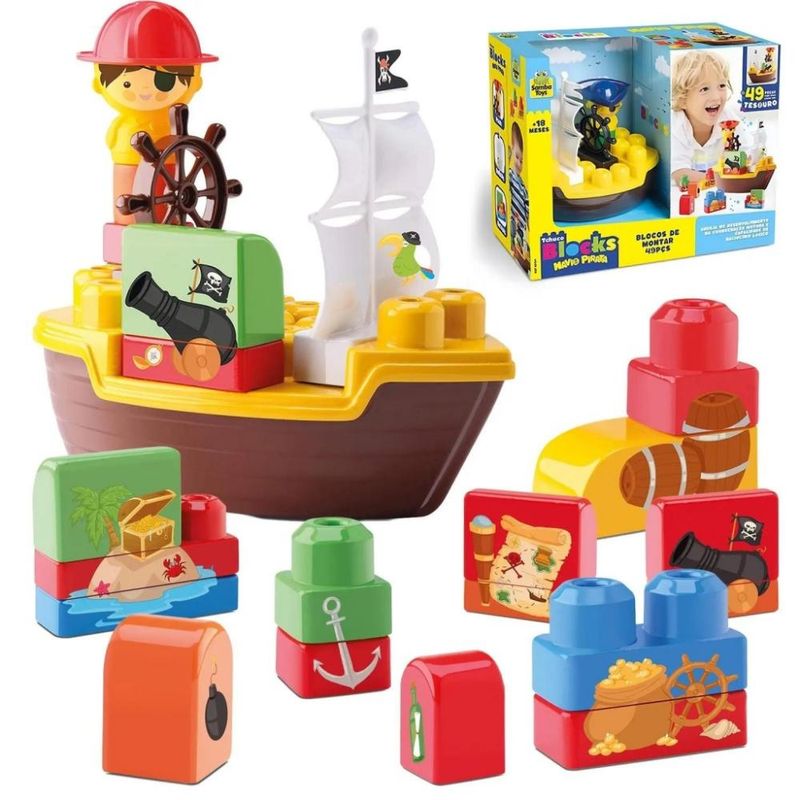 A partir de agora, a brincadeira vai ficar ainda mais divertida com o conjunto de blocos de montar Tchuco Navio Pirata da Samba Toys. Um incrível Navio Pirata para muita diversão enquanto os pequenos desbravam os 7 mares! Com blocos seguros e grandes para as crianças se divertirem enquanto estimulam sua coordenação motora, raciocínio lógico e percepção de formas e cores. Composto por 49 peças, entre elas um pirata para infinitas maneiras de brincar e se aventurar criando suas próprias aventuras. É a combinação perfeita para proporcionar entretenimento, aprendizado e diversão para as crianças. Produto 100% seguro para seu bebê. \n\nIdade recomendada:2-4 anos;Composição/Material:Plástico;Funciona com pilhas:Não;Brinquedo com luz:Não;Brinquedo com som:Não;Dimensões:26,7x34x15 cm;Peso:0,791 kg;Código de Barras:7908759402645;Garantia do Fornecedor:3 Meses contra defeito de fabricação;