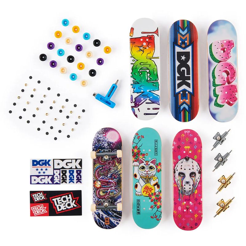 6 Skate Tech Deck, 4 Truck, 20 Rodinhas, 26 Parafusos, 2 Adesivos, 14 Porcas e 1 Ferramenta.
