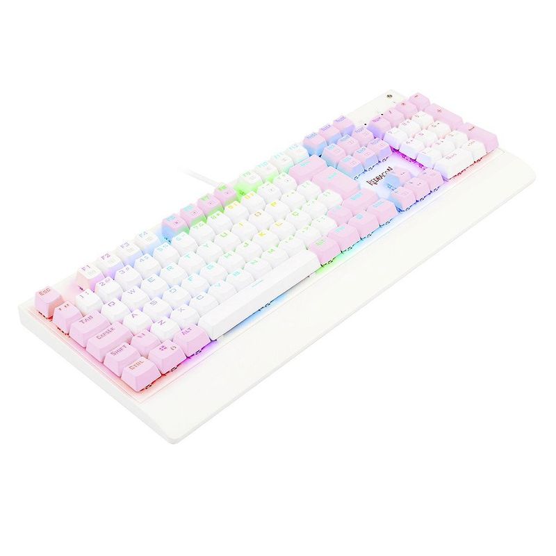 Nome: TECLADO MECÂNICO GAMER KALA RGB BRANCO COM ROSA SWITCH AZUL ABNT2Marca: RedragonPart Number: K557WP-RGB (PT-BLUE) Características:- Apoio de pulso integrado para maior conforto até mesmo durante longos períodos de uso.- Teclado full size para os usuários que não podem ficar sem o teclado numérico em jogos ou durante o uso diário.- Iluminação RGB Redragon Chroma Mk.II individual por tecla trazendo mais brilho para seu setup.- Keycaps feitas com o método double shot injection resultando em legendas duradouras.- Layout ABNT2 feito especialmente para o mercado brasileiro.- Funcionalidade para bloqueio da tecla Windows. Especificações:Switches: Redragon Mk.II DIY BlueAcionamento: MecânicoHotswap DIY: SimCOR: Branco com rosaFormato: Full SizeDesign: Teclas FlutuantesLayout: ABNT2Conectividade: USB 2.0Software: SimAltura Ajustável: SimMateriais do case: Plástico ABSIluminação: RGB Redragon Chroma Mk.IIRollover: N-Key RolloverComprimento do cabo: 1.8mKeycaps: ABS Doubleshot