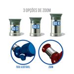 - Zoom ajustável em 3 níveis: 40x, 60x e 80x