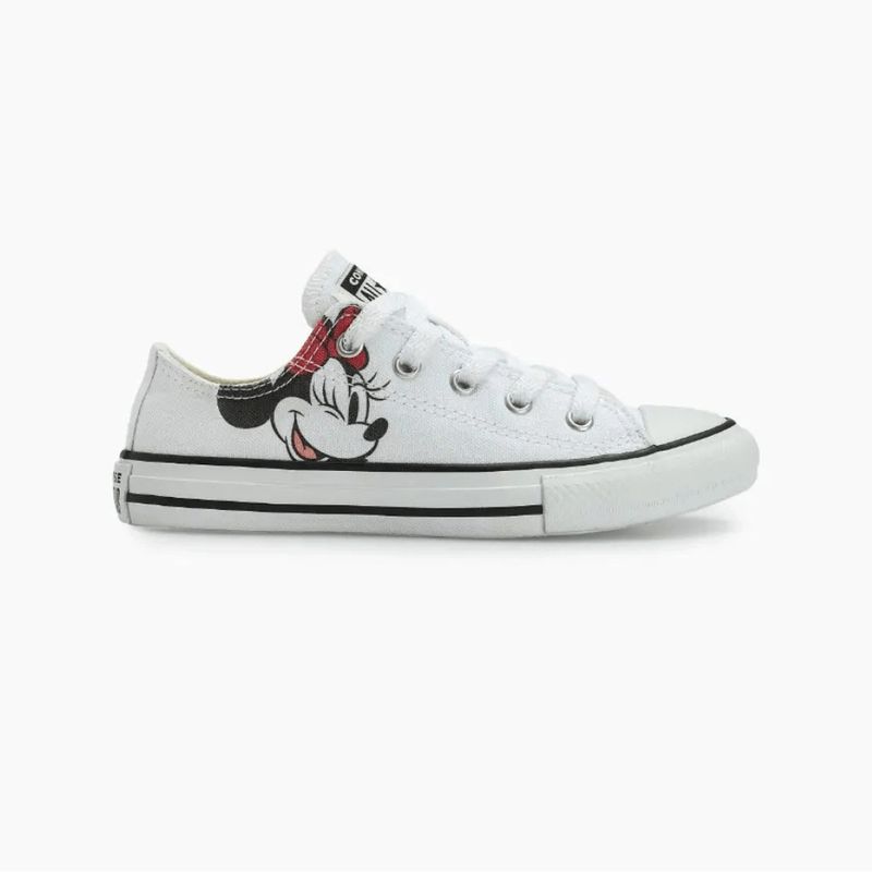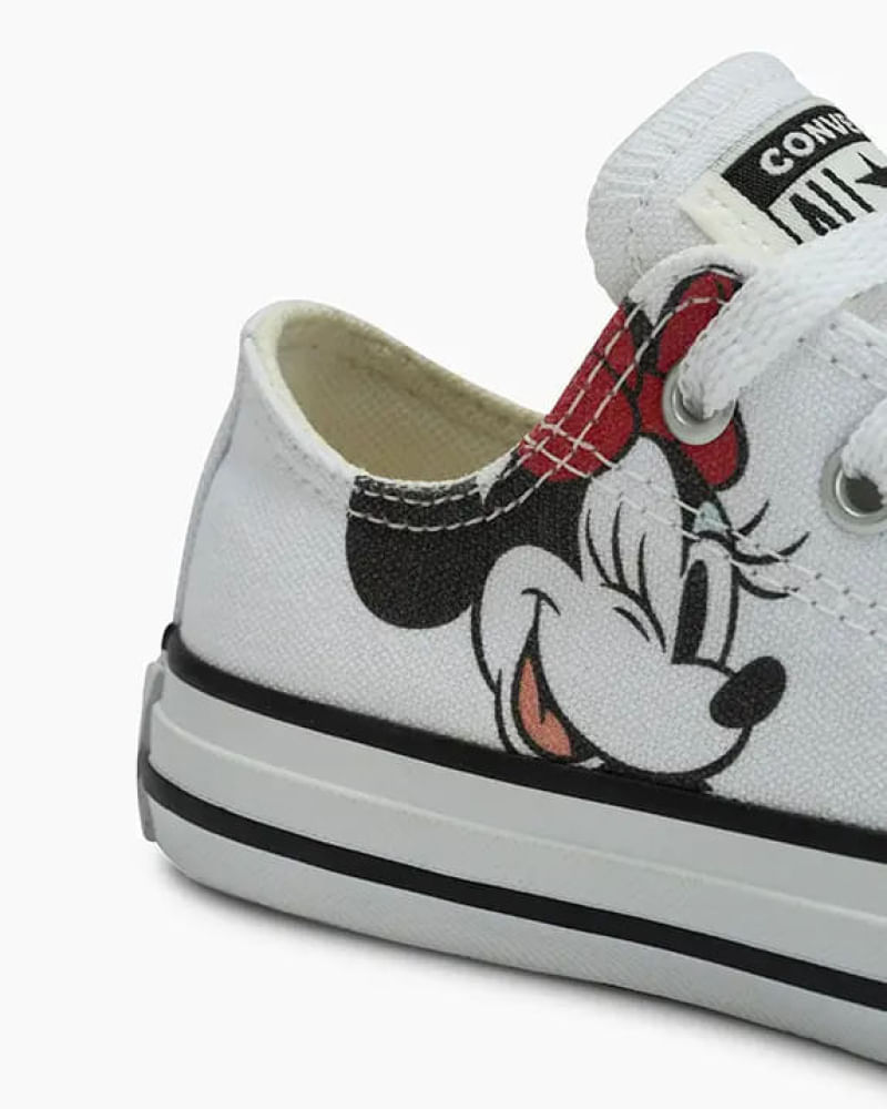 O clássico Chuck Taylor All Star na versão kids recebeu um toque de mágica na colaboração Converse x Disney. Para celebrar sua personagem mais amada, a Converse apresenta a coleção Minnie, trazendo referências a rata mais fofa do mundo para o dia a dia dos pequenos. Confeccionado em tecido tipo lona de algodão, o modelo traz o rosto do Minnie aplicado na lateral externa, costuras duplas, uma tira de tecido no calcanhar que proporciona maior suporte ao tênis, forro interno acolchoado para maior conforto e dois ilhoses laterais para uma transpiração adequada aos pés. O logo Converse All Star é aplicado na tag da língua e na heeltab do calcanhar. O solado vulcanizado garante a aderência adequada ao caminhar.