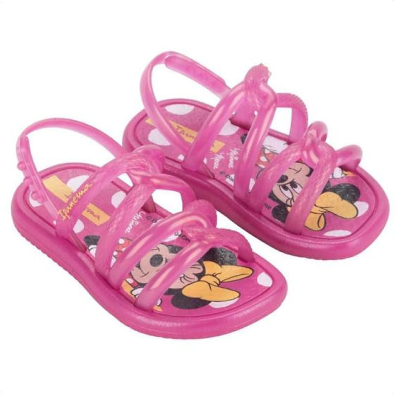 Sandália infantil, confeccionada em PVC, tiras com textura com textura, tiras traspassadas no cabedal, nome da marca em alto relevo, estampa Minnie, personagem da Disney e fechamento por tira no calcanhar.
