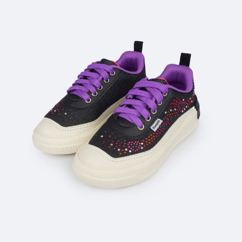Tênis infantil feminino com glitter e detalhes de aplicações hotfix em pedras strass formando corações, super fofo, além de possuir recortes em sintético, dando modernidade ao calçado! Tênis infantil com forro interno que auxilia na absorção do suor e espuma macia no calcanhar. Palmilha Feet Care que possui um sistema avançado de fofura, com a densidade ideal para os pés, minimizando impactos. Tênis com calce em cadarço, para a menina poder ousar nas amarrações.