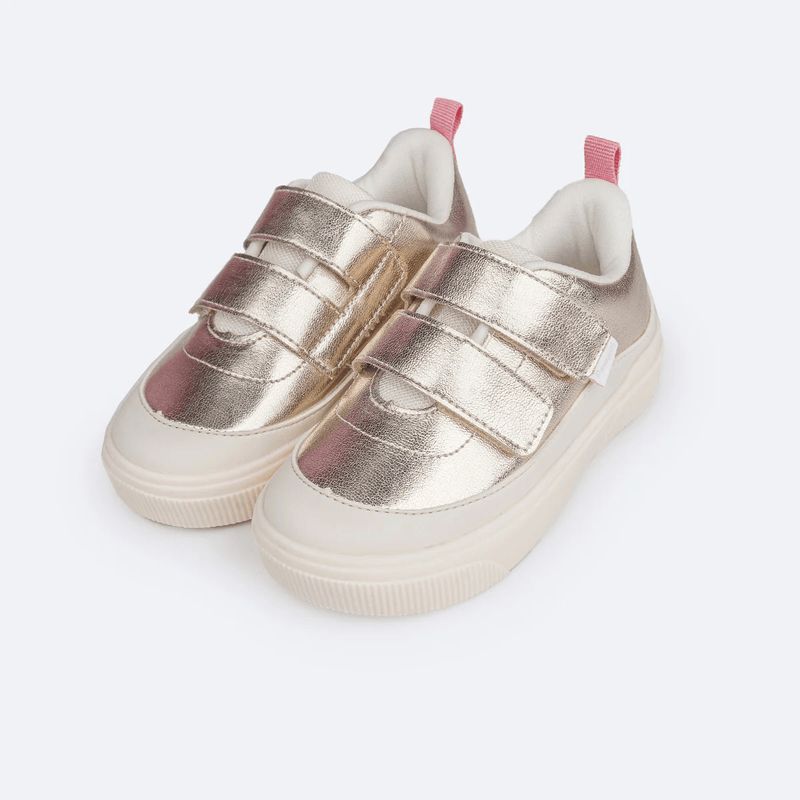 Tênis feminino em sintético dourado, clássico e atemporal para a menina usar no dia a dia e na escola! Tênis feminino com forro interno que auxilia na absorção do suor e colarinho super comfy, para maior conforto ao caminhar. Palmilha Feet Care que possui um sistema avançado de fofura, com a densidade ideal para os pés, minimizando impactos. Tênis com calce fácil em velcro duplo, dando autonomia para as meninas e facilitando o calce para as mamães. Tênis de solado emborrachado super inovador, formando desenhos de flores, além de sua flexibilidade e aderência. O solado possuí escrita em braile indicando o lado direito e esquerdo para meninas cegas ou com baixa visão!