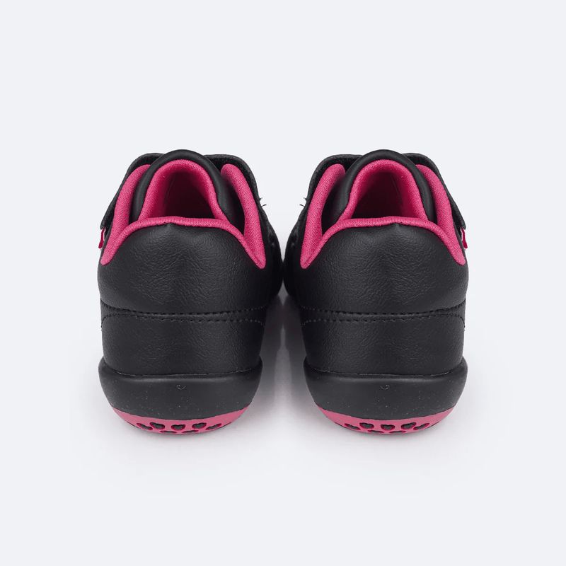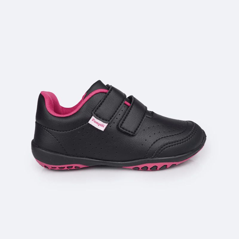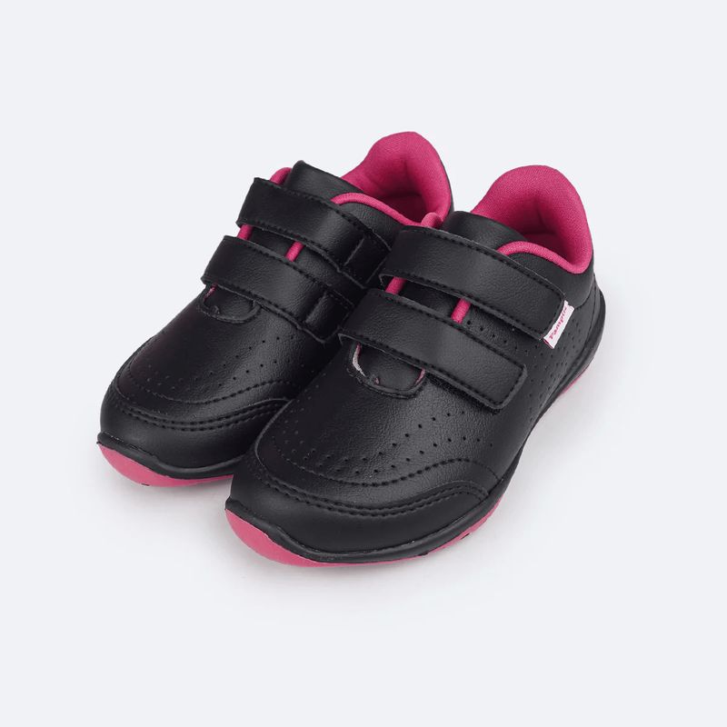 Tênis escolar infantil em sintético preto, com detalhes em perfuro que dão um toque especial ao visual! Forro interno que auxilia na absorção do suor e espuma no calcanhar, trazendo um super conforto para os pezinhos durante o uso na escola ou passeios. Palmilha anatômica, para mais conforto ao caminhar. Tênis escolar feminino com solado super flexível, leve e antiderrapante, dando segurança para o uso no dia a dia. Tênis com calce fácil através de tira em velcro.