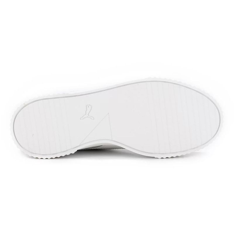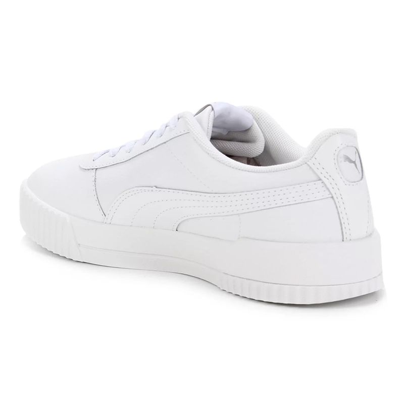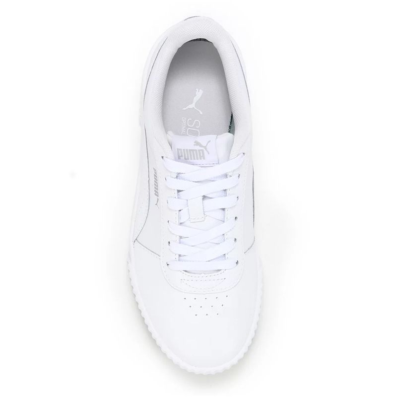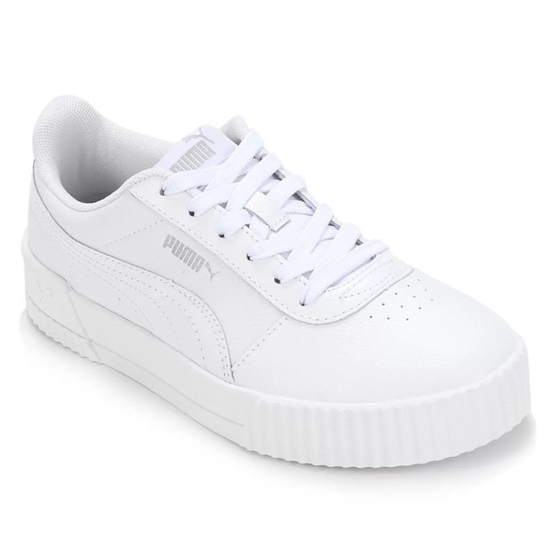 Aumente seu estilo e conforto durante o dia a dia com o Tênis Puma Carina L. Seu cabedal é confeccionado em material sintético, proporcionando assim uma ótima durabilidade e conforto. Conta com a entressola em borracha, ligando-se ao solado, oferecendo maior durabilidade e ao produto. Conta com fechamento por cadarço, oferecendo o ajuste ideal para cada usuário. Seu design é de cor totalmente branca, e traz apenas pequenos detalhes, como o logo Puma Cat, em cor prata. Referência: 375565.
