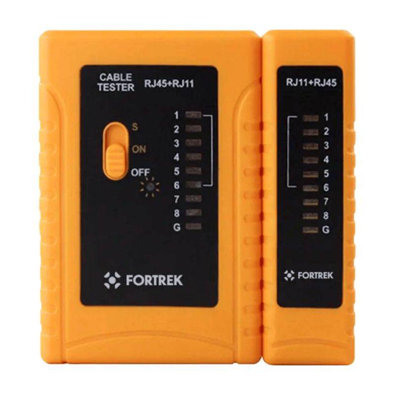O Testador de Cabos Lan RJ11/45 Fortrek TCF101 é uma ferramenta de medição que visa o bom funcionamento do cabo de acordo com as especificações técnicas em rede de computadores e redes telefônicas. Verifica continuidade de fios, circuito aberto, curto-circuito e tempo de propagação do sinal através de LEDs na base e no receptor; possui entrada para testar e certificar cabos de telefone (Rj-11) e cabos de rede (Rj-45).